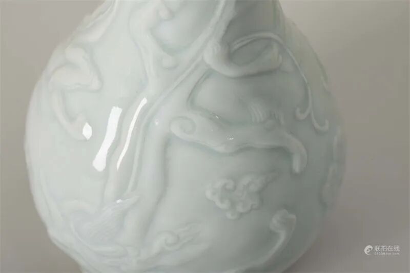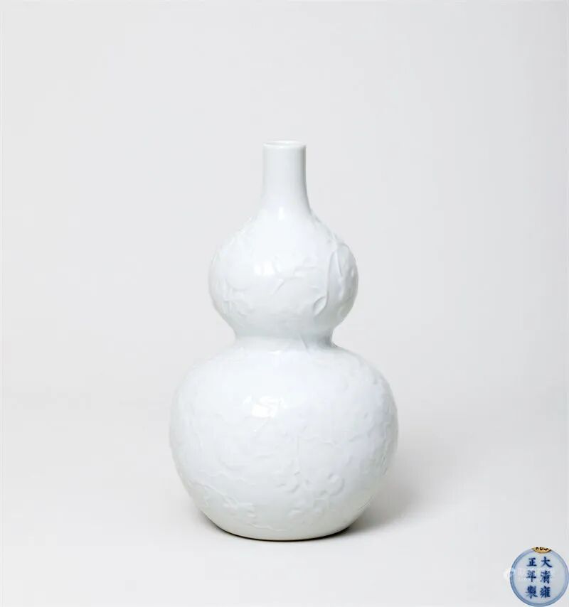 瓶式小圆口,直颈细瘦,葫芦式腹,圈足内卧,足内青花楷书“大清雍正年制”,款字隽俊,色泽淡润。其制器玲珑洁然,细匀沉厚,外壁满饰藤蔓葫芦,葫芦圆实饱满,形如本器,枝叶宽匀,其采用剔地浅雕之技法,花纹层叠拱起,故名“拱花”。其雕工超凡,层层推开无一错乱,雕饰诸纹一丝不苟。镌花虽繁,但构图匀正,疏密有致,又以银素白釉敷施,遂显素洁清丽,浮莹光润。本品器制细雅,风格隽润,团实可爱,极为稀见,与本品完全一致者暂未有见。