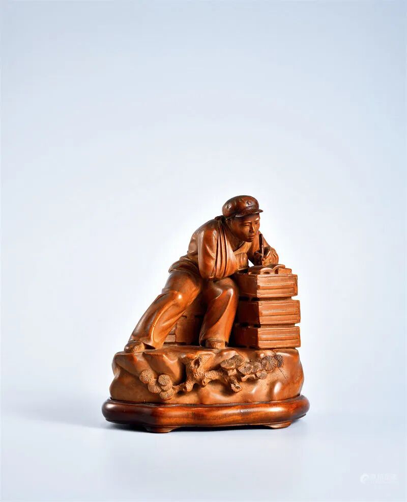 拍品估价:80,000 - 120,000 人民币此尊作品以上等黄杨木为材,塑造士兵身着军装,倚靠并斜坐于弹药箱上,躬身习作,右臂缠绕绷带,显然已负伤,五官刻画写实,神情极为专注。此像眉目传神,将负伤士兵勤奋读书的场景表现的淋漓尽致,非高手不能为,充分表现出那个年代坚守初心的峥嵘岁月,具有极高的历史价值。