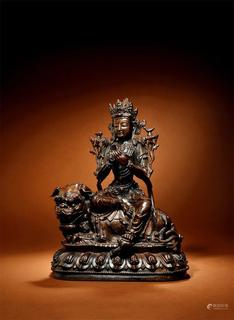 拍品估价:300,000 - 500,000 人民币此尊观音以泥心失蜡法铸造,姿态端庄,自在座于雄狮背上,闲情逸致,双手胸前各捻一株莲茎,花茎沿手臂升至双肩在肩头盛放,右肩莲花上置净瓶,左肩莲花上瑞鸟驻足。其面颊丰润,双目含苞,上眼帘较宽,五官写实,相容寂静,现慈悲祥和之女相。头戴枝蔓缠绕的宝冠,发髻高耸,耳际宝缯飞扬,胸前饰有多个“U”形连珠式璎珞,肩披络腋,下身着长裙,生动自如,具有鲜明的明代汉地造像风格特征。坐骑雄狮姿态威猛,侧首下视作吼叫状,张口吐舌,造型生动,鬃发五官刻画极为传神,似乎正在聆听菩萨的教诲,与闲逸的观音菩萨融为一体。下承覆莲式莲花座,莲瓣饱满挺括,瓣尖微翘,最上层端头饰有花卉纹,制作精致,颇具永宣造像之遗风。