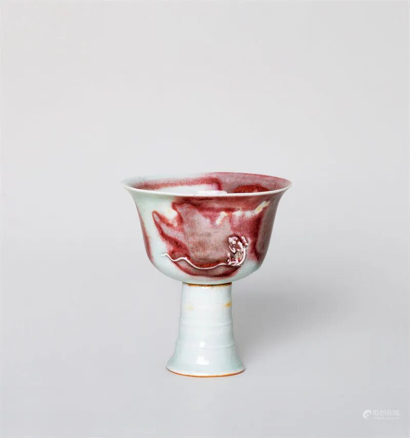 拍品估价:250,000 - 350,000 人民币1.《中国の漆工芸》,东京松涛美术馆,1991年,页23,编号11。2.《宋元の美—伝来の漆器を中心に》,日本根津美术馆,2004年,编号13。此盘造型、漆色搭配均为宋代素漆制品之典型,盘形规矩中透露出雅丽之气。木胎折沿式盘,尺寸硕大,口沿起拦水线,胎壁厚薄适中,作十二瓣莲花式,弧壁随口沿律动起伏,平底下具随形圈足。盘内髹红色大漆,并遍洒深绿色星片为饰,隐约可见,富含蓄之美。外壁及底髹黑漆,底心朱漆篆书“尚奉东君”款识。尺寸:高9.6cm;顶部直径8.7cm;底部直径4cm拍品估价:2,000,000 - 5,000,000 人民币杯式圆口外撇,深腹,高柄足,柄身环修竹节样,修足爽利,足端露胎,质地坚实,胎表呈火石红色。杯内印花拱起作月影梅纹样,外壁设一螭龙攀于器腹,采用堆塑技法,施泥细腻,长尾飘荡,螭身拱起,镂一细孔以充杯把。其内外淋施红釉,泼洒自然豪快,晕染如天际火云,鲜浓璀璨,光润夺目。此杯巧设机关,杯柄与杯腹未作封实处理,其柄中空,内置泥丸与杯腹相连,使上下两部分可随心转动,增添酒宴乐趣,属元代新制式样。铜红彩之运用初见唐代长沙窑,笔抹斑块、花纹,中高温烧造,较好者呈色紫红。而成熟之釉里红瓷自元代始见,时间较青花瓷器更早,内所烧佳者光彩照人,但因彼时工艺尚未完善,故完品少有,且经年即久,传世尤为珍罕,今见一二即以为宝。