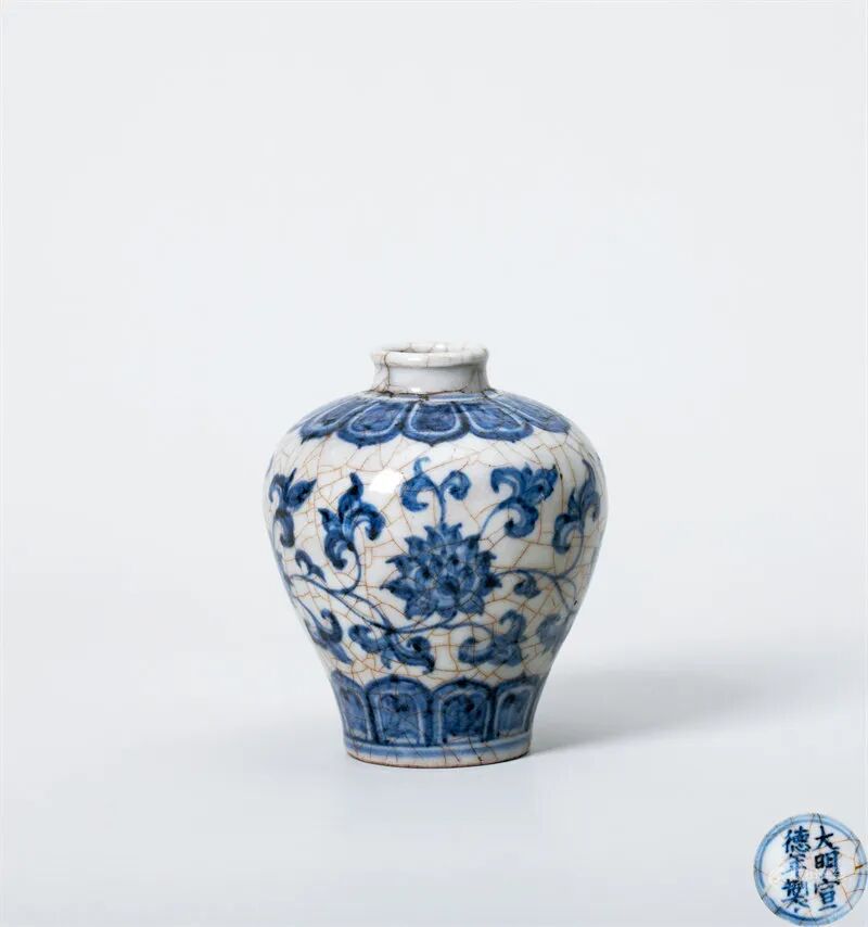 瓶式圆口起滚唇,细短颈,端肩长腹,圈足,足内书“大明宣德年制”青花楷款。其款字方劲,匀正宽匀,极富书风。此瓶制坯细厚,入手沉着,施釉亦颇肥润,细密若堆脂。釉下青花绘画,肩、胫皆设莲瓣俯、仰相对,围衬中腹之缠枝莲花,其花头上锐下丰,瓣尖微翘,花叶勾连外展,映带左右。诸饰运笔平稳沉着,一丝不苟,青花深浓,发色蓝正略紫,青料所聚之稍浓处,有锡斑浮泛。本品存世罕有,可比较之例甚少,检点公私收藏宣瓷数千件,暂见一例而已。乃原属大维德爵士旧藏,现存大英博物馆,编号PDF,A.634,其施釉光润,用色浓郁,惜绘笔稍粗,配附原盖甚为稀见。