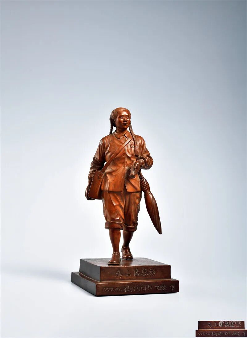 拍品估价:100,000 - 150,000 人民币款识:“为山区服务”、“1959.4.1. 福州木刻艺术社 阮宝光作”作者简介:阮宝光,生于1925年,福建福州人,擅长木、牙、寿山石等雕刻。1936年就读于省立实验区工读学校,从艺于雕刻艺人柯经煊;1954年入中央美术学院华东分院民间艺人进修班学习 ;1956年调入福州木雕厂,福州市授予“一等艺人”称号;1957年创作黄杨木雕《帮助小同学》、《海防前哨》入选省首届工艺美术展览会,分获一、二等奖;1960年调入福州市工艺美术研究所;1979年调任福州市雕刻总厂研究所副所长、高级工艺美术师;1982年,作品《巫山神女》获轻工部全国木雕作品百花奖评比优质产品奖;1986年退休。以整块黄杨木圆雕作女学生像,面容姣好,发辫垂肩,面貌向上,斜挎书包,左右握手电筒,腕部挂雨伞,昂首阔步前进,形成雕像之艺术语言。整器细节刻画清晰,衣纹表现流畅自然。下承原座,座缘镌刻:“1959.4.1. 福州木刻艺术社 阮宝光作.”此件雕像木质缜密细腻,色泽温润光洁,人物形象刻画传神,具有浓郁的时代气息,为雕刻大师阮宝光作于1959年。福建的雕刻工艺自清代起便盛而不衰,涌现出诸多著名的艺人,此像作者阮宝光即为颇具代表性的一位。