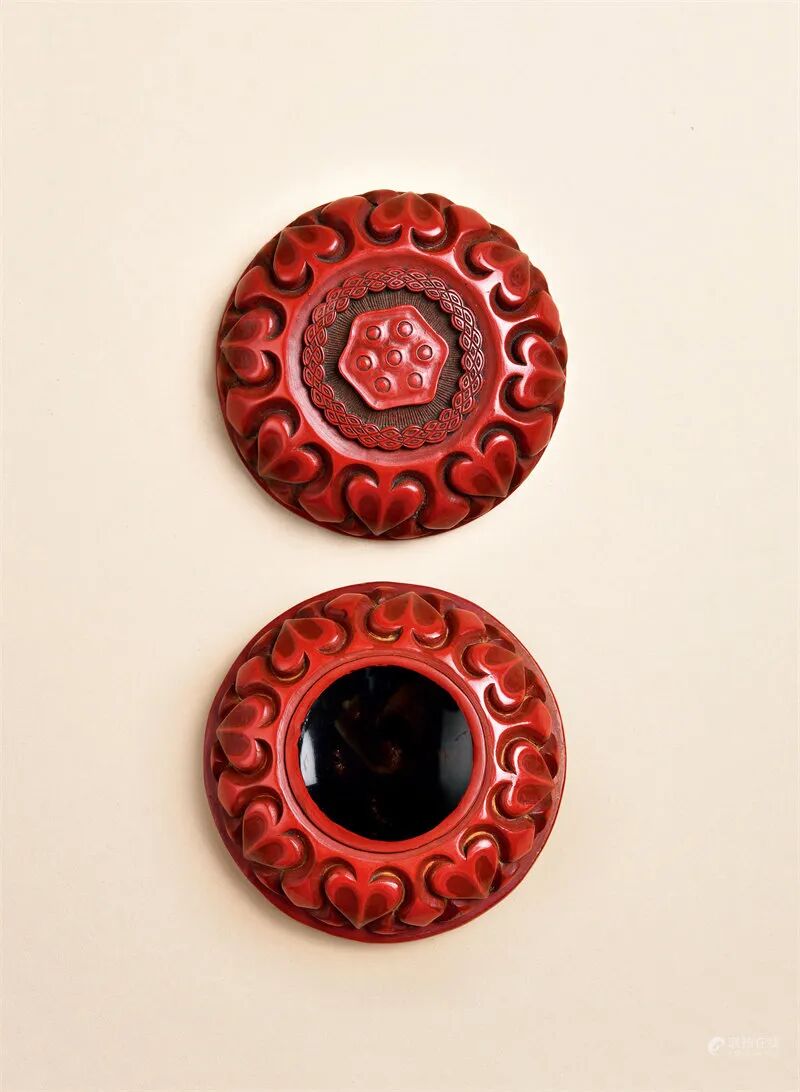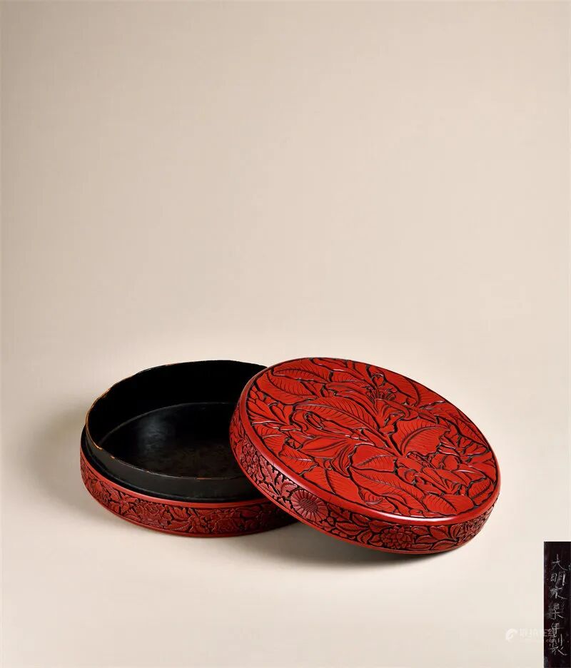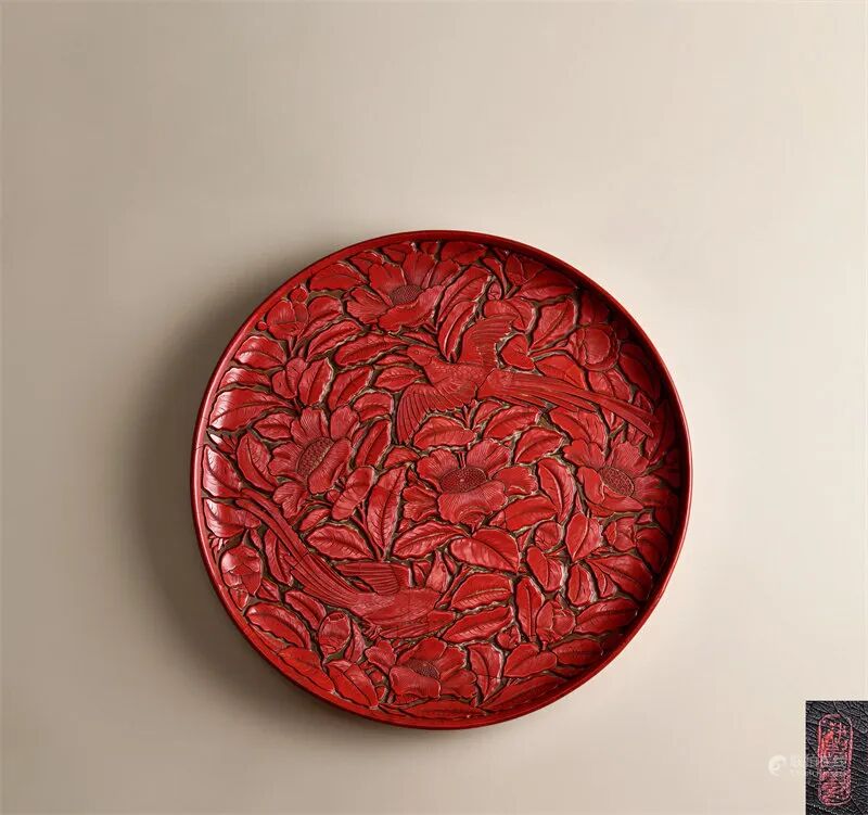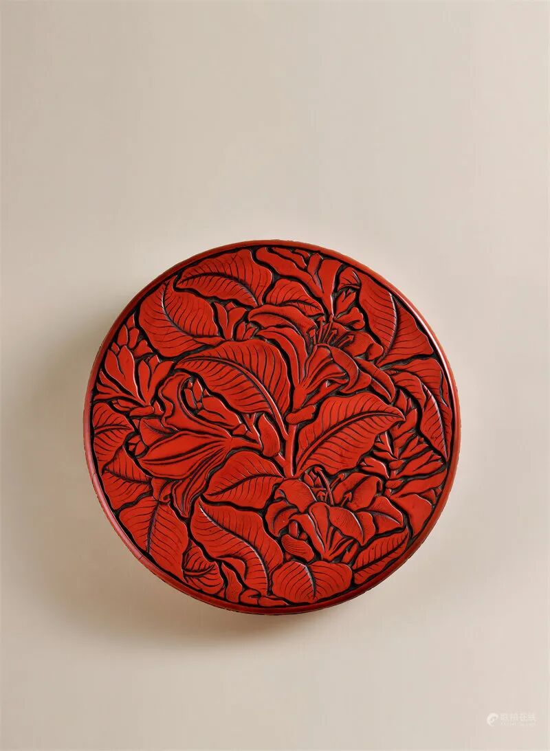 拍品估价:800,000 - 1,200,000 人民币备注:附包装及供盒。盖内题识「文政十年(1827年)十月……中将……」此盘呈圆形,舒展大方,口沿圆润光滑,漫浅底,圈足。通体先在木胎上以赭黄色漆打底,上面再逐层堆上朱漆,剔刻出各式纹样,故而在空隙间可以看出黄色的素漆地。盘外壁满饰香草纹,线条粗犷豪放,回旋生动,风格质朴,只见线条不见刀痕,显得十浑厚。盘内黄漆素地上髹层层朱漆,双绶带鸟盘旋飞舞于茶花丛中,茶花硕大,烁烁盛放,枝叶舒卷,娇艳欲滴。足内与盘底髹黑漆,漆面可见自然断纹,古色古香。