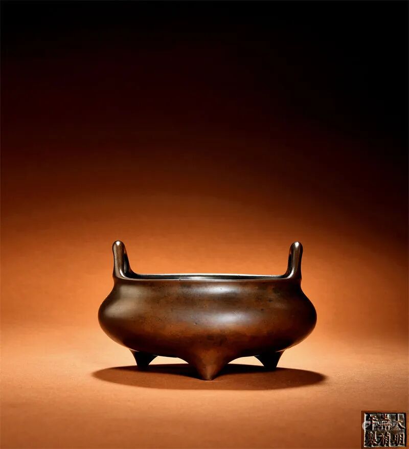 拍品估价:1,500,000 - 2,000,000 人民币展览:《辨物:崇祯时期的宣德炉辨物》,中国收藏家协会·明清宣德炉收藏委员会。斯炉具崇祯朝之典型特征,形制极美,线条圆润挺括,为明代典型之器物,文人气度尽显。口缘薄挺,内撇外侈,上起双冲耳,势外倾,耳洞腰圆,浑如卧卵,凹颈,炉腹垂腆而富态,线条圆润,丰腴肥硕,至胫平收,三个倒三角形乳足分布于炉底,精妙窈窕,足尖着地面积极小,是为时代之特征。通体淳朴素面,尽得明代审美之大宗。炉底微弧近平,底心开框铸“大明崇祯年制”六字款,全字取楷书,工丽整饬,字体拙而俊健,有魏碑风骨,皆用刀刻精修,线条古拙奇崛,笔意甚浓,六字不计工拙,看似随意,然仪轨森然,书写意趣籍于制作层面,也可读出造款者匠心独具,为典型明崇祯本朝款式。