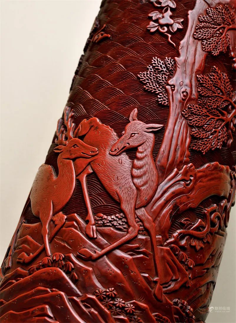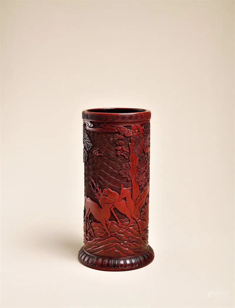 拍品估价:200,000 - 300,000 人民币此件作品形制粗浑,挺拔端庄。内壁及底髹黑漆,圆口,宽唇沿饰连续的回纹一周,直筒腹,以水波锦纹为背景,其上压雕雌雄双鹿漫步,顾盼有情,瑞鹿身体膘壮,肌体丰健,双目圆睁,兔唇闭合,双耳翘立,四腿高瘦,雄鹿珊瑚形犄角粗韧有力,配合立姿,后腿微弯,前蹄点地,顿使鹿姿闲适之外充满了灵动之气。周围山石叠嶂,古木参天,流云弥漫,又有蝙蝠翻飞,葫芦缠于树梢,灵芝瑞草崭露头角,“福寿延绵”之意不言而喻。筒身下承覆莲式圈足。拍品之经筒器型,多见于明中期至清代早期瓷器之上,为庙宇供器,可放置卦签、香箸、香铲之用,后渐渐演变为炉瓶三事中的瓶,存世稀少,雕漆制品更是凤毛麟角。