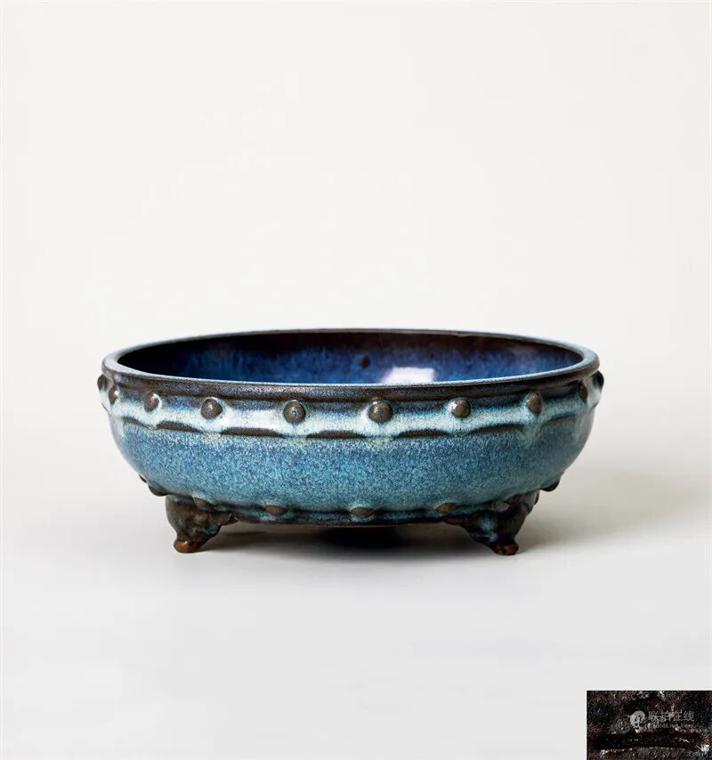 器式圆口,微起方唇,弧腹,壁稍直,下三足承起,足作如意云状。外口及胫部环饰鼓钉。器底甚平,暗刻 “二”字铭,并存支痕一周,支端细圆。全器内外施天深青色釉,釉质匀厚,开片纹。其色调深蓝闪紫,釉内有淡白色细纹交织,随釉层流动,釉薄处泛荧光,有蜡质感。底面施褐釉,俗称“芝麻酱底”,又施釉起伏不平,为官钧器之特征。后雍正、乾隆御厂摹造钧釉瓷器,其底釉亦起伏不平,呈黏坠质感,意即模拟该特征。按钧窑器底有数字“一”到“十”者,现习称“官钧”,西人则称为“Numbered Chun Wares”,即“数目字钧瓷”。又因造型皆为诸式花器,故又称“陈设类钧瓷”。其烧造年代曾倍受瞩目,旧定北宋宫廷督造,并将其与宋徽宗之“花石纲”相联系。但就近年考古发掘及相关研究,此类“数目字钧窑”皆属明十五世纪钧台窑供用宫廷而专造的作品,并与景德镇御厂作品两相呼应。其依造型变化、工艺精粗,可分“粗放”及“精致”两型。“粗放型”官钧制器稍显墩厚,刻款草率,支痕粗疏;“精致型”官钧则器壁较“粗放型”稍薄,款字精正,支痕密集而较细巧。本器即属后者。