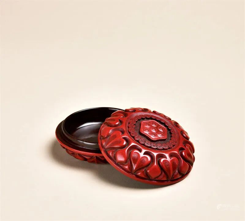 拍品估价:180,000 - 280,000 人民币蒸饼式圆盒,盒内髹黑漆,整体作俯视莲花形,中心为六角形莲心,内有莲子七颗,外接雄蕊花丝,花药连作花环状,最外层及盒侧作桃形瓣,瓣间心形犹如重叠花瓣,整齐中不失灵活。漆色红润,漆层坚实,漆层厚重,刀法深邃利落,漆面及转折处打磨平滑,以莲花为形,将花瓣重叠的关系抽象化,造型富具创意,全器布局与造型十分协调,圆润饱满。