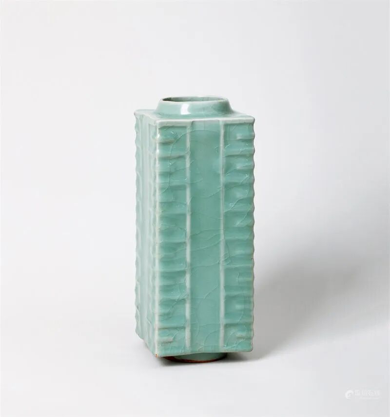 尺寸:高约:25.4cm;口径约:6.3cm;足径约:6.7cm;腹径:9.8cm拍品估价:800,000 - 1,600,000 人民币瓶式圆口,颈甚短,四方身长直,圈足,修足爽利,足端呈火石红色。此瓶周身方正,制器团实,四角凸起横纹,模拟上古玉琮之切角装饰。内外罩施匀净青釉,釉色纯粹青美,色泽青而微蓝,冷淡天然。釉中聚沫攒起,质地凝厚,内开莹亮片纹,又因四方身形,故釉有流淌,局部淡露细白胎色,与青映衬,雅贵腴美。