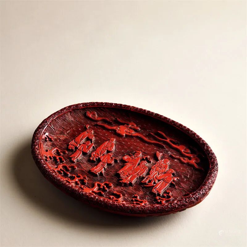 拍品估价:250,000 - 350,000 人民币盘作椭圆造型,敞口弧壁,浅腹圈足。足底髹黑漆,漆面断纹明显。内外壁均以雕漆工艺装饰。外壁饰缠枝卷草纹回旋,自然形成的云纹为饰。盘缘宽厚圆实,雕以细密的锦花。盘内通景雕刻,横折锦纹作天,水波锦纹为水,其上压雕图案,祥云缭绕,八仙踏步海上。整器造型朴拙,髹漆肥厚,漆质坚实,刻画生动,题材少见,寓意吉祥,极为珍贵。