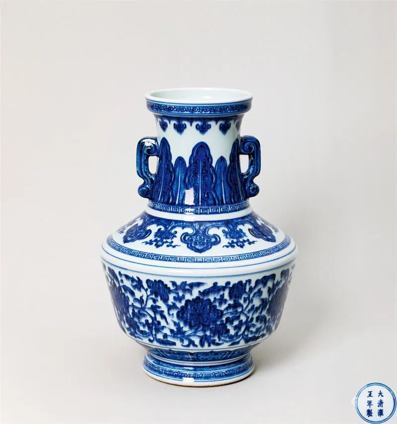 尺寸:高33.8cm;顶部直径12.7cm;宽 23.5cm;底部直径13.3cm拍品估价:1,500,000 - 3,000,000 人民币记录:佳士得香港,2013年5月29日,Lot 2010器式圆盘口,长束颈对设双云耳,折肩方腹,收胫,高圈足外翘,修足宽圆,足墙匀厚,底署“大清雍正年制”青花楷款,书字韶秀而美。此瓶制器沉着,施釉稍厚,清亮攒沫若脂玉。釉下通身青花绘饰,口设云纹,颈绘蕉叶,肩垂云头,腹环缠枝莲纹,胫、足用莲瓣及卷草收尾,端庄华贵,腴美典雅。此器之绘饰构图匀正,用笔细隽而谨,行线沉稳却无板滞之气。其青花呈色蓝艳,勾线中用平涂、点染等技法交替填色,浓淡相接,疏密有韵。所采点染技法,为模拟宣德青花之呈色特点,细密堆垛,沈浓郁丽,故曰“仿宣”。而各饰浓淡不同,亦使环壁的程式图样不落僵死单调之弊。其肩设云头垂坠中间填卷草,缀以桃实,稍具西洋风貌。