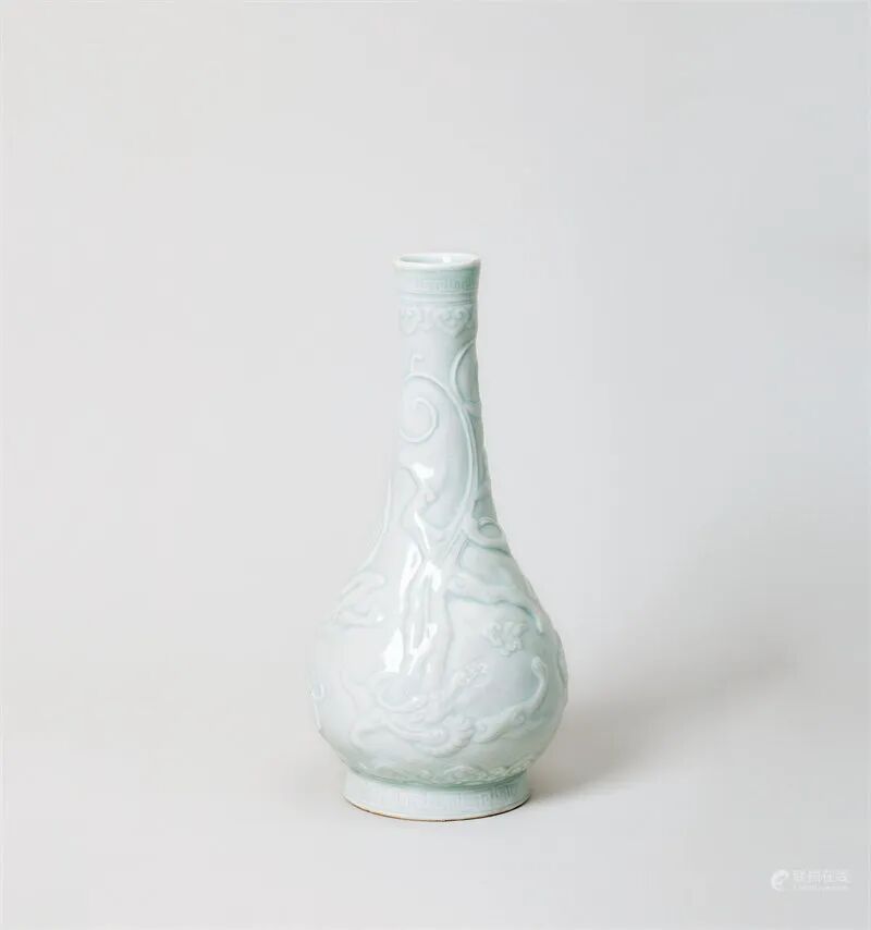 尺寸:高19.4cm;顶部直径3cm;宽 9.5cm;底部直径6.8cm拍品估价:2,000,000 - 5,000,000 人民币记录:伦敦苏富比,1991年6月11日,Lot.175此瓶工致殊常,前所未见。其小口长颈,垂腹圈足,制坯沉着,敷釉淡色青白,堆起莹莹,脂润如玉。瓶壁深雕流云行螭,双螭大小相对,面貌各异,一则自空俯降,虎首独角,另一仰首欲腾,龙首长吻,二者皆卷尾细挺。间设团云长流,譬青空万里。其雕镌极精,龙身凸起,细须拂动,腹甲层然,面目精容,神情宛宛,细卷尾勾绕瓶身,几欲离器而飞。此瓶所施大小双螭,应典自宋人“教子升天”,老螭见龙在天,小螭扬起欲飞,取亲亲教导之意。此瓶固极罕有,而“教子升天”之螭龙流云穿行的纹饰及构图却流行宋代,且影响深远。晚明士人慕宋极盛,物器玩好以宋制为珍,故彼时亦多拟宋造器,螭龙图饰亦在此时深受欢迎。