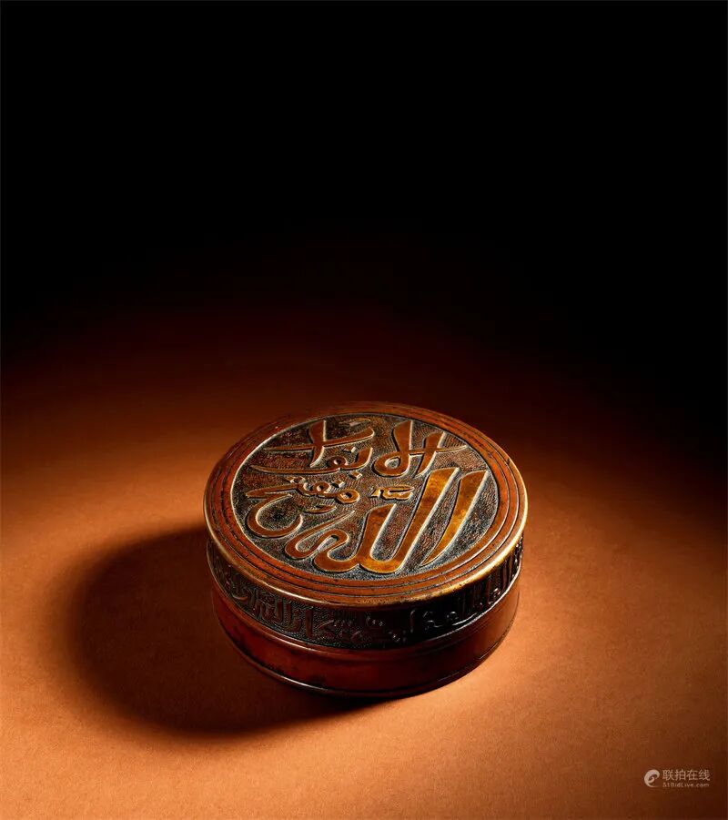 尺寸:口径13.8cm;高5.6cm;重1881g拍品估价:800,000 - 1,000,000 人民币1.北京大羿,2017年12月4日,编号0312,“明正德 铜阿拉伯文炉瓶盒三事”,盒直径12cm,成交价RMB 43,700,000。2.《集古赏今—天津市文物公司成立五十周年纪念》,天津人民美术出版社,2011年,页129。3.《钟鼎茗香-荣斋清供珍赏》文物出版社,2013年11月,页114-115平顶、直壁、平底,造型扁圆硕大,规矩有佳。盖、身子母口相合,上下均起弦纹装饰,盒内膛上下隐显施蜡旋纹,典型明代铸造之手法。盒面以三条弦纹围成的开光内,以珍珠锦纹为地,饰以阿拉伯文唯一真神可兰经文句,文字流畅优美,刀法精准。盒身光素,盒盖外壁亦在珍珠锦地上,取材自清真言中内容,善祷善祝,以为祈福,书写流畅,有刀笔合一之功,非正德宫廷不能为之。