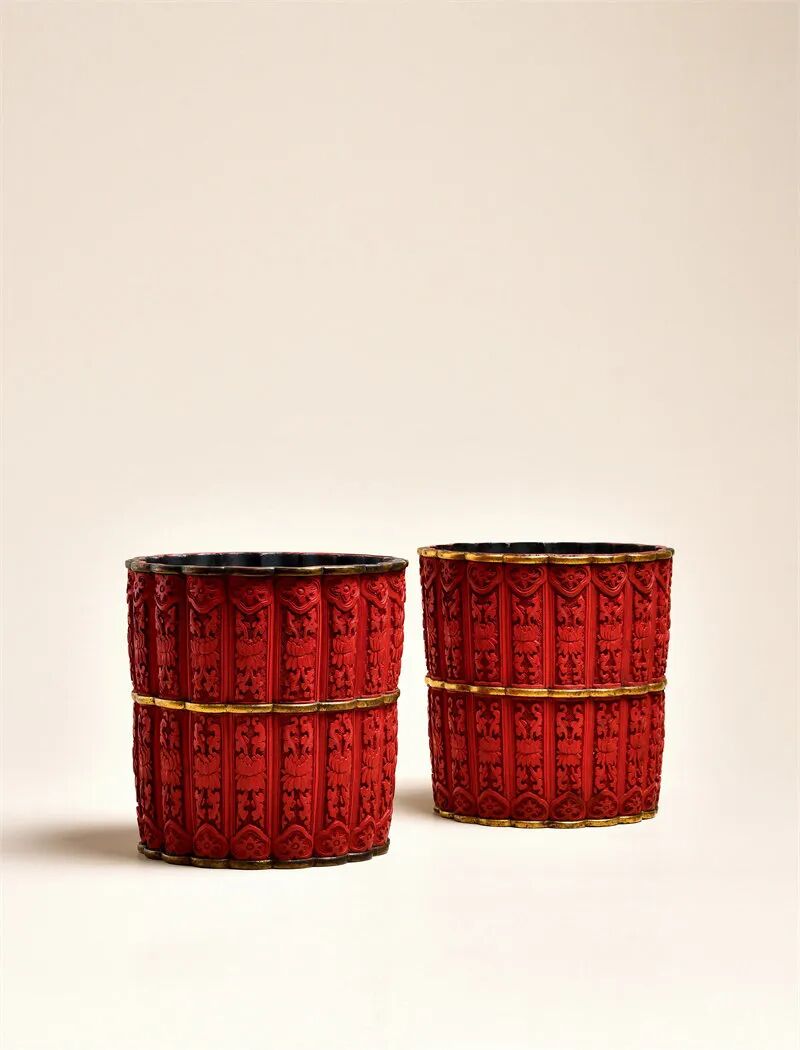 拍品筒式花盆一对,形制如一,器壁斜直,自上而下渐敛,似取诸竹节精制而成,起伏律动,远望俨然。平底及内壁髹黑漆,余部以剔红工艺装饰,沿上饰城垛纹一周,外壁口沿、足胫对饰俯仰如意云头纹,每面在回纹锦地上饰缠枝莲各一组。口沿、中腹、底缘均镶以随形铜鎏金箍圈,为整器增添富丽之姿,亦可寓“三思”之意。清宫花盆式样丰富,材质多样,参考清宫陈设文件和宫廷绘画作品可知,不同材质的花盆使用功能不一,存在明确的分工。金银、漆器、铜胎珐琅等花盆均为殿堂室内陈设器,承托相应的琼树玉花等人工盆景,故宫博物院藏清宫旧藏一件“剔红筒式盆岫岩石万年青盆景”,与本品制式相仿,文物号:故00125483。