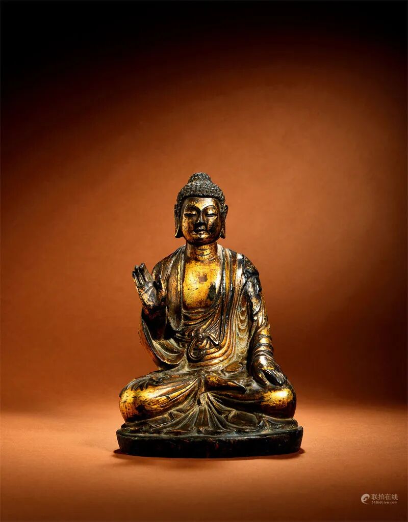 拍品估价:600,000 - 800,000 人民币参阅:香港佳士得,2018年5月30日,编号2856,“唐·鎏金铜佛陀坐像”,高度14.6cm,成交价HKD 2,375,000。本尊造像全跏趺端坐,袒露上身,着袒右肩式通肩大衣,腹前系结,左手施无畏印,右手扶膝,最为精美之处则是袈裟刻划逼真,衣褶自然流畅,不仅疏朗与繁密相合适度,且有着强烈的轻薄贴体,柔软飘垂的立体感,是金铜佛像中艺术价值极高的作例。这种衣袍自然下垂,轻柔垂飘、疏朗流畅的写实手法起源于北魏,东魏开始流行,唐代则达到顶峰。