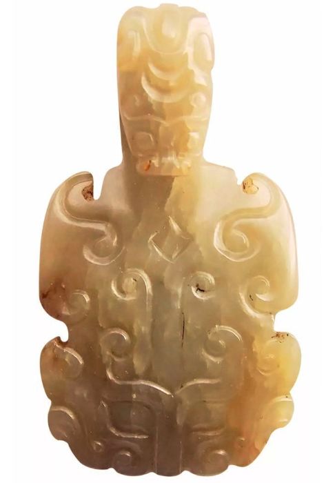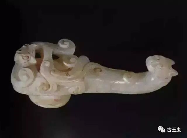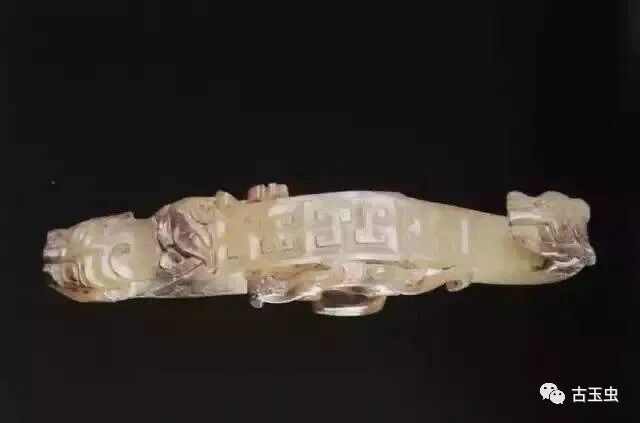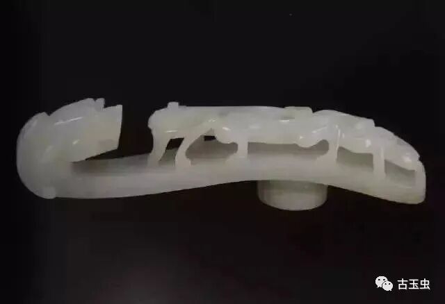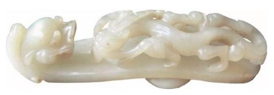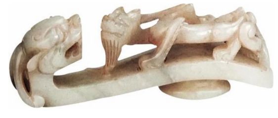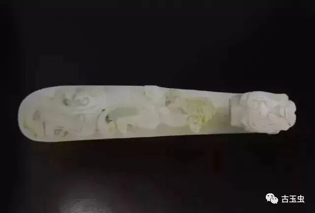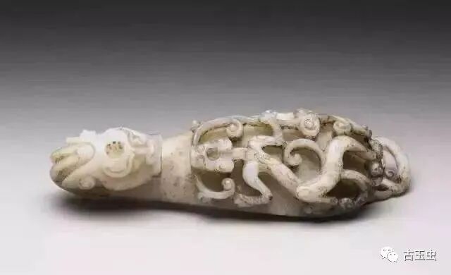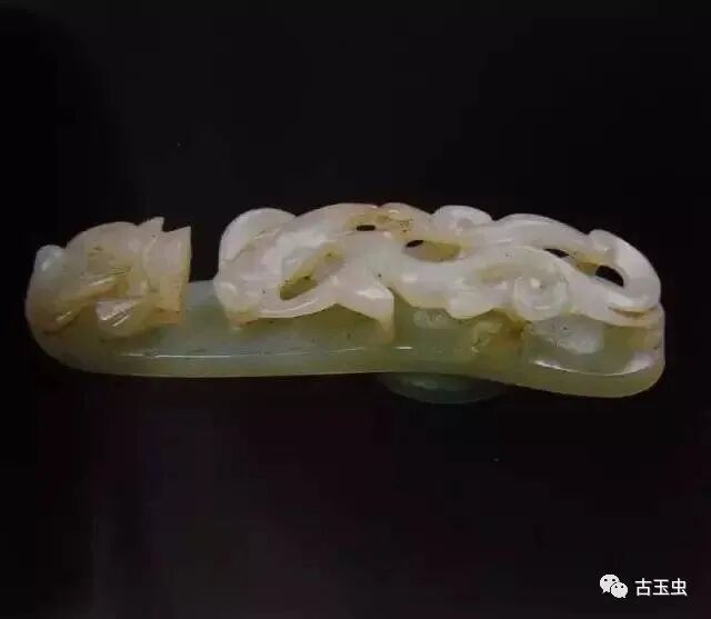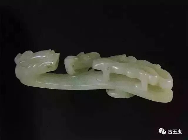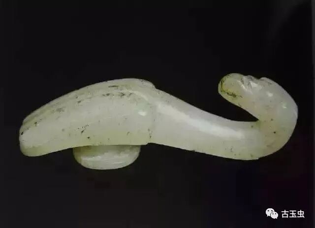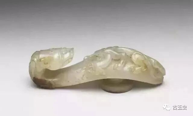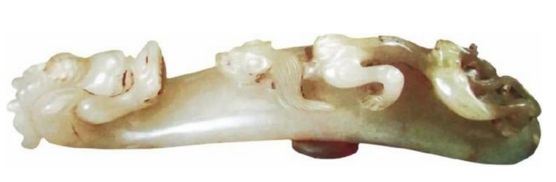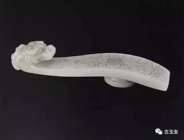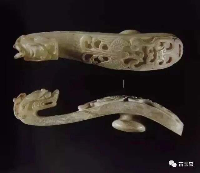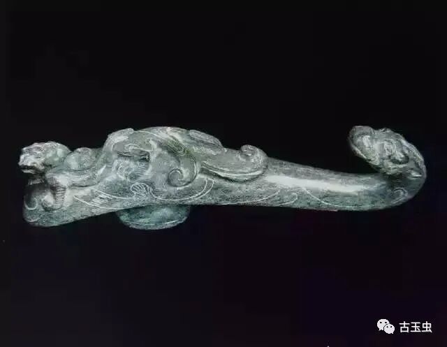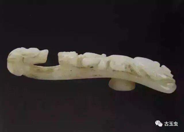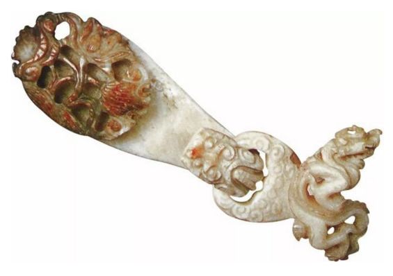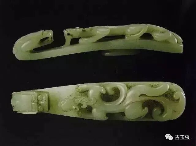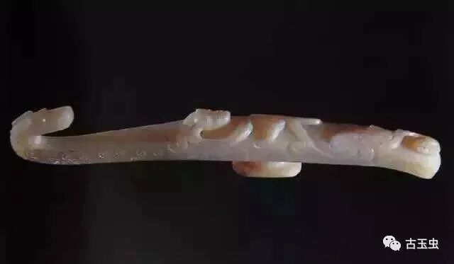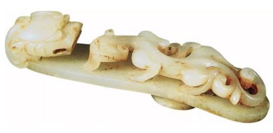 这一时期的玉带钩多较大且长,钩首以龙首和禽首为主。装饰除阴刻纹饰外,龙首形状也渐从抽象发展为写实,钩体开始出现浮雕与透雕蟠螭纹饰。钮逐渐向钩体中部移动。