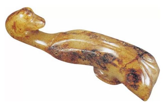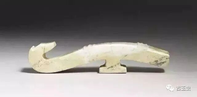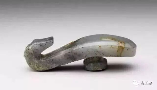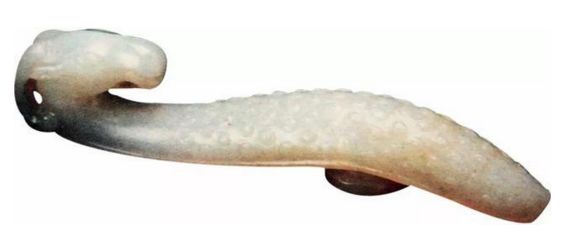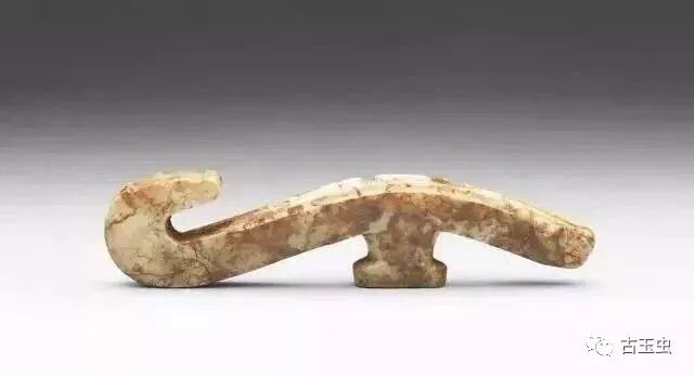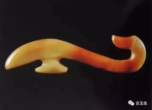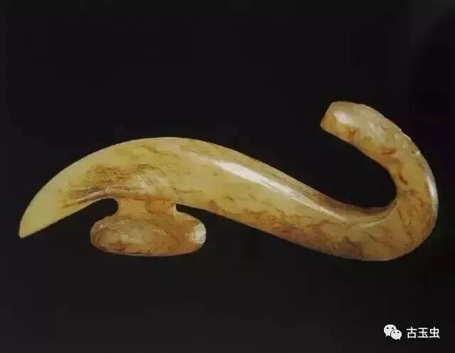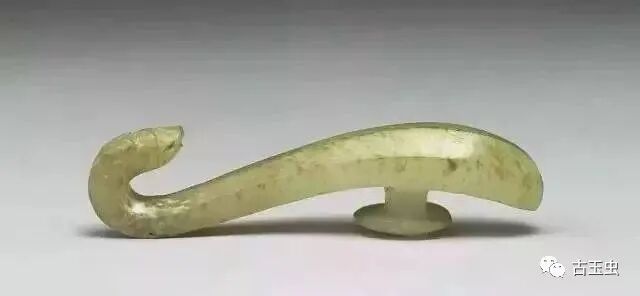 这是迄今为止发现的最早的玉带钩,来自距今4000多年前的良渚文化遗址,这些玉质带钩是用事先修整好的长方形玉块切割钻磨而成,一端有穿系的孔,另一端做钩形,用于钩系,用法是钩首向内。钩首较长,束带牢实而不易脱钩,实用性较强。从其精美程度看,良渚文化时期的玉带钩已经具有了礼器的性质。从其沿袭和发展来看,这种玉带钩主要流行于战国至汉代。