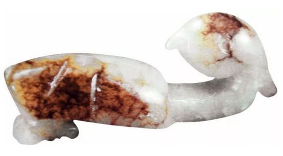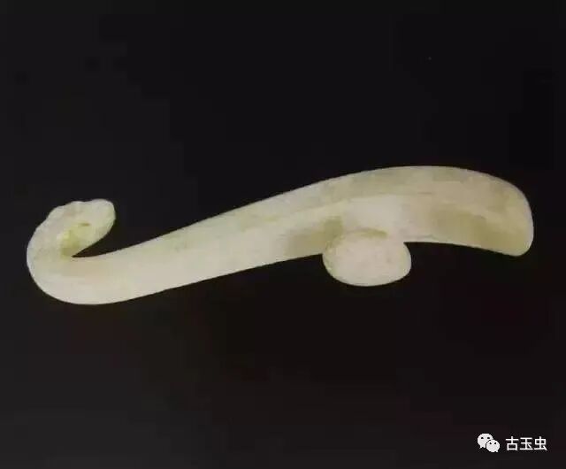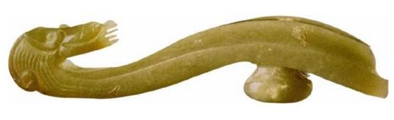 战国时期玉带钩形制确立,即钩首、钩身、钩钮组合完整。形制多为长条形和饰有几何纹饰的琵琶形,小的玉带钩长只有4~5厘米,均以优质和田玉制成,显得凝重精巧。其中龙形玉带钩的特色鲜明,成为战国时期代表作品和断代标准器形。另外,具有典型特征的尚有以下几种: