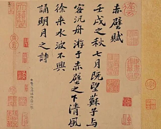 台北故宫博物院藏。末署“大德辛丑正月八日,明远弟以此纸求书二赋,为书于松雪斋,并作东坡像于卷首。子昂。”辛丑为大德五年(公元1301年)时赵孟頫48岁。这里仅选《前赤壁赋》部分。该帖分行布白疏朗从容,用笔圆润遒劲,宛转流美,风骨内含,神彩飘逸,尽得魏晋风流遗韵。