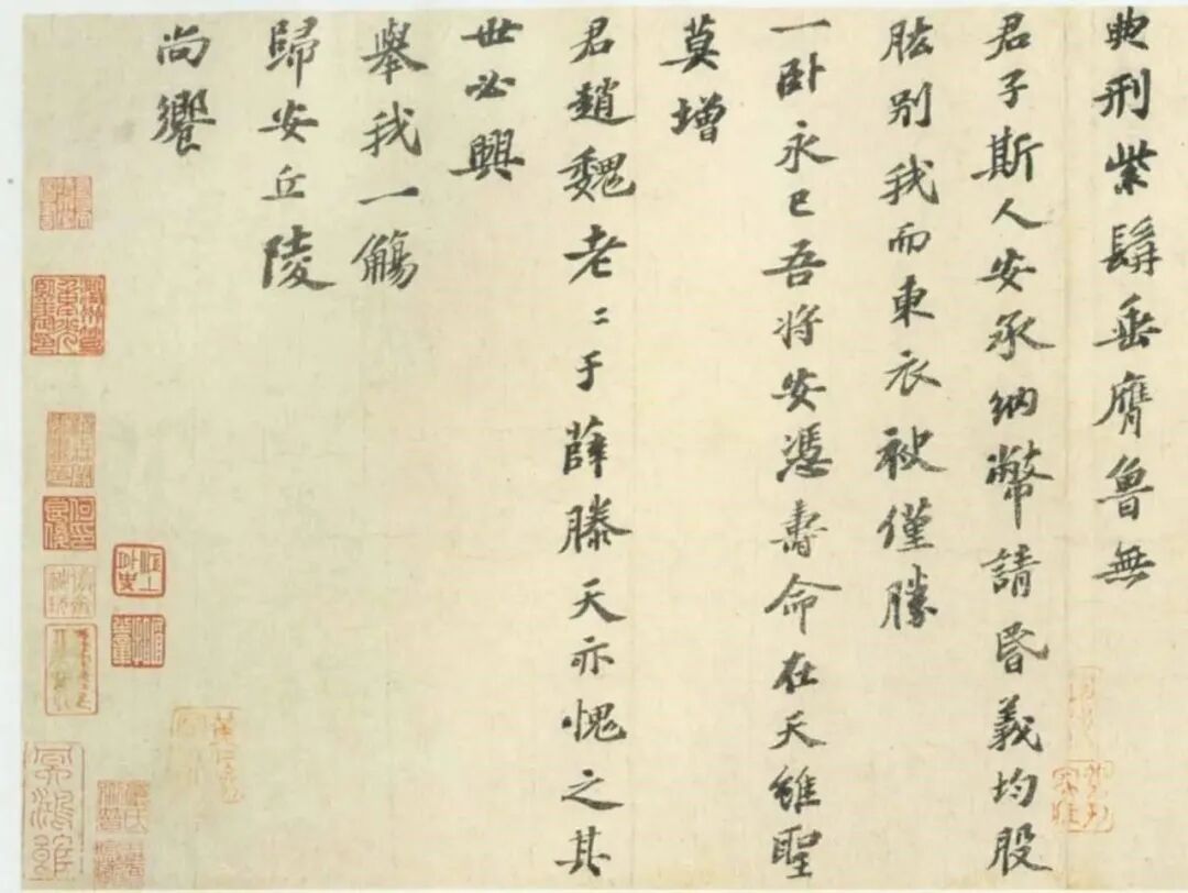 此卷点画沉着,质朴多变,无疑是承袭了晋魏楷书的风流。在楷书技法方面,苏轼深得魏晋遗风,用笔丰富,态势多样,既得风神俊爽之形貌,又含质朴古拙之内蕴。