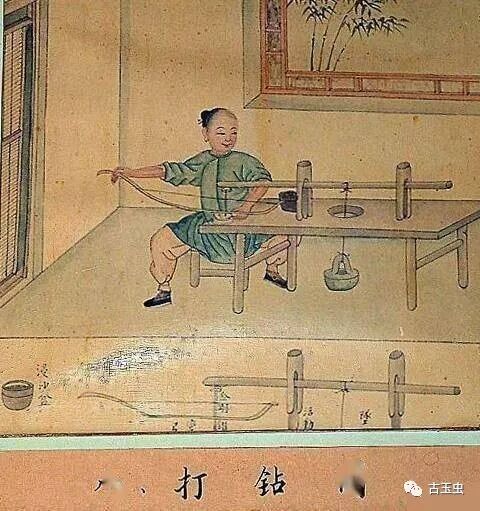 这是对于一些要雕琢镂空花纹的玉器,所做的一个重要步骤。打钻的工具主要是弯弓和轧杆,轧杆底端镶有金钢钻。玉工坐在桌子的一端,用左手握着玉器,抵在轧杆下端近金钢钻的下面,右手来回拉动弯弓,弯弓会带动轧杆一来一回旋转,杆尖所嵌的金刚钻就可以把玉钻出一个圆洞了。