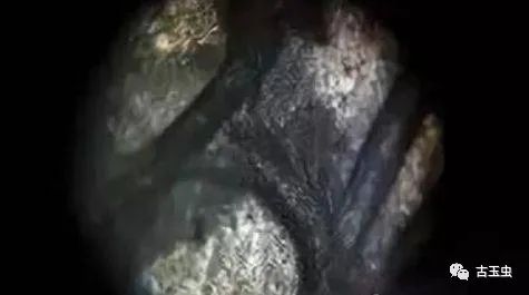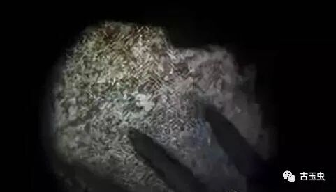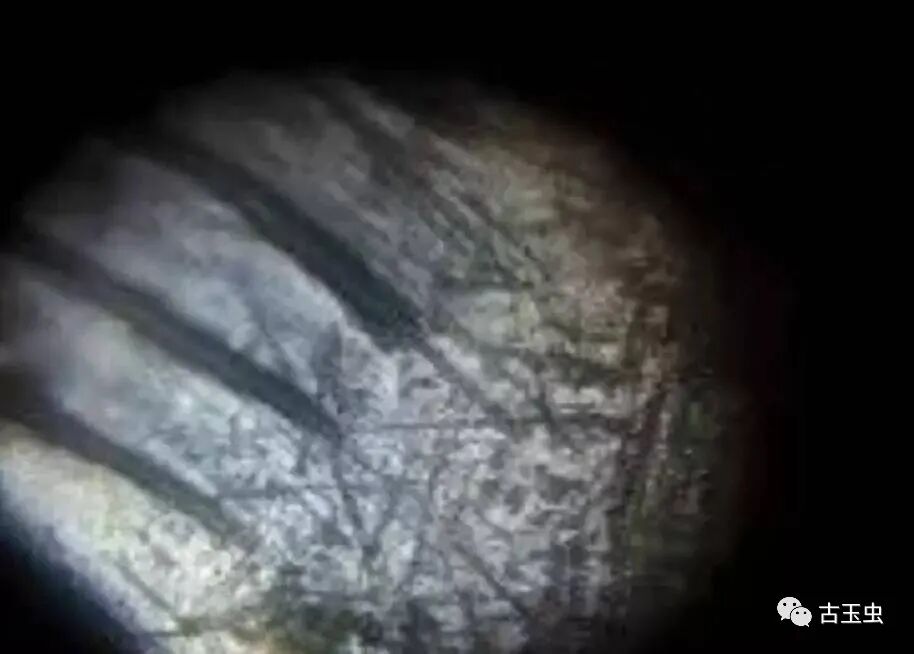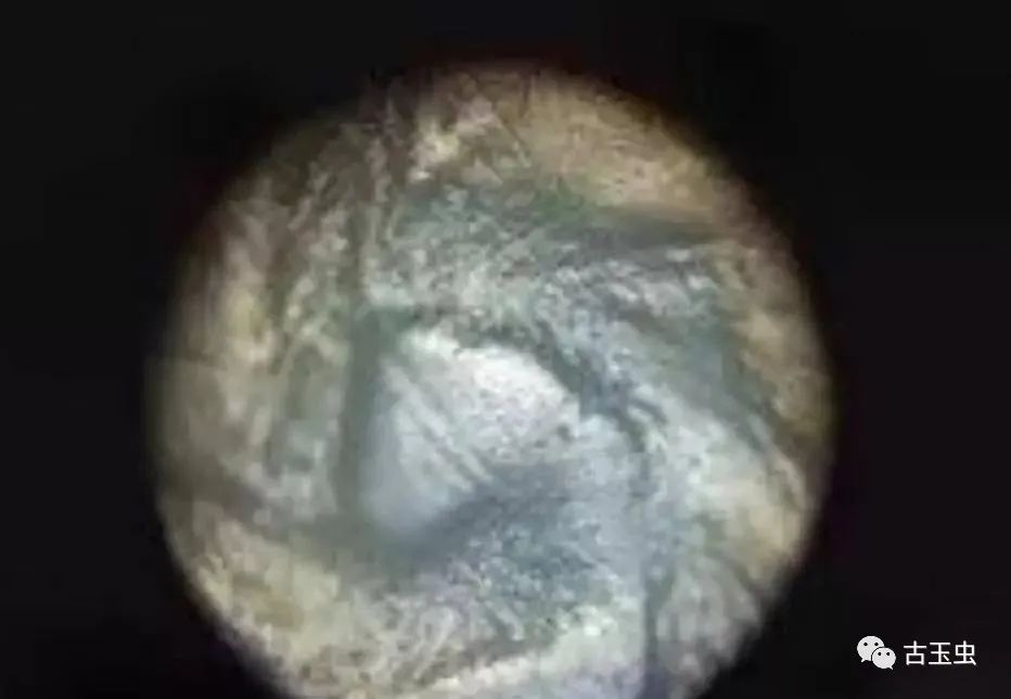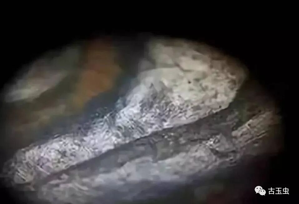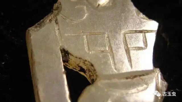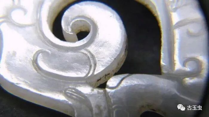 而仿古玉为了达到阴刻线里也有包浆,一定需要用布砂轮进行抛光上光处理,所以会出现阴刻线里很亮的特征,这是不对的。还有一点就是真品古玉阴刻线的平整度相比表面抛光后的平整度来讲,会差很多,不平整的结果就是对光线造成漫射,自然反射到我们视觉中的光就少了,所以我们会感觉到暗。