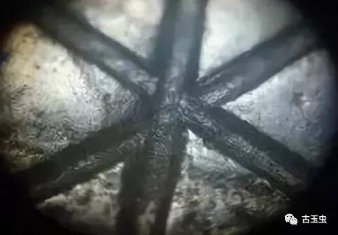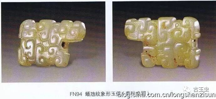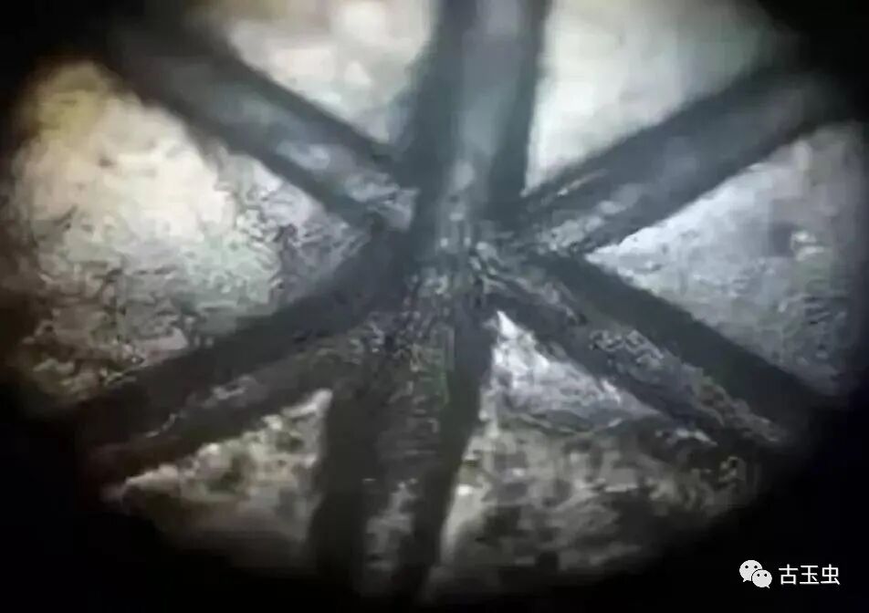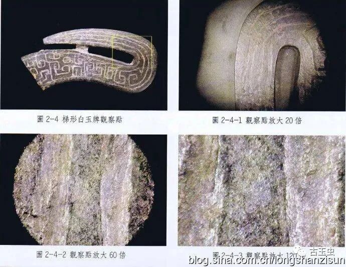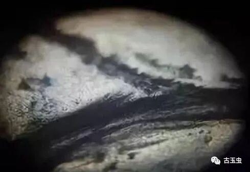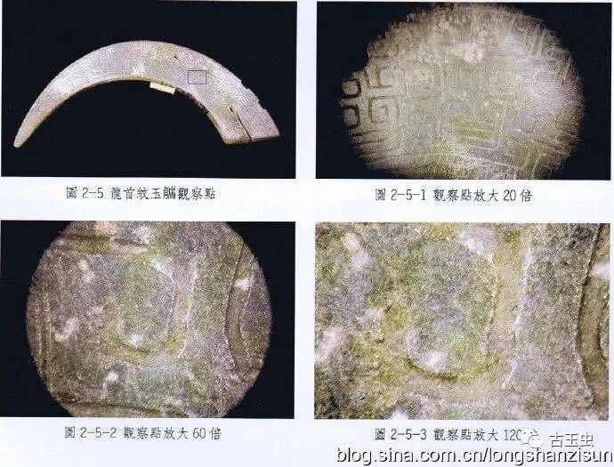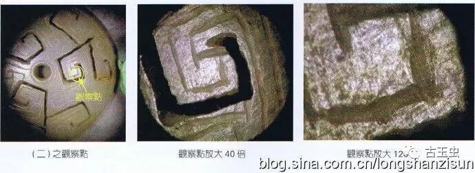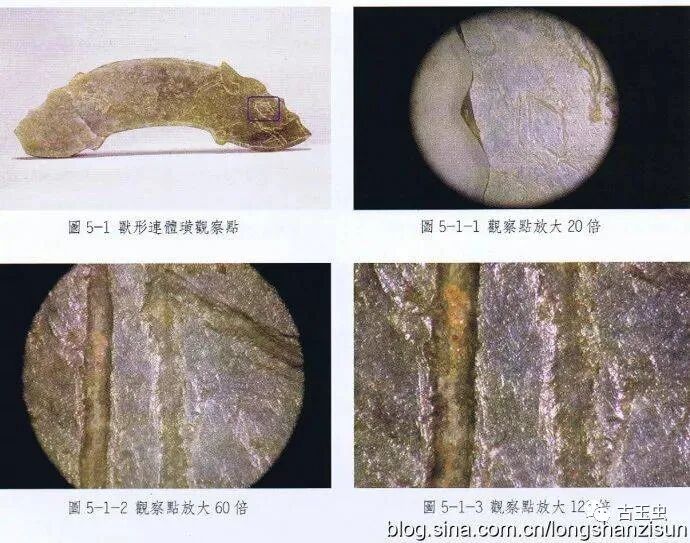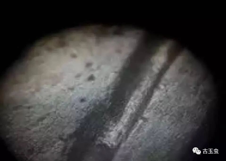 有极个别的真品古玉表面阴刻线也出现少许崩茬,这是由于被加工的玉料的结构特性较脆和疏松所致。接下来以一组图片进行演示如下: