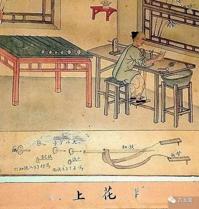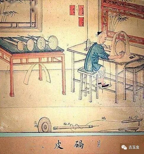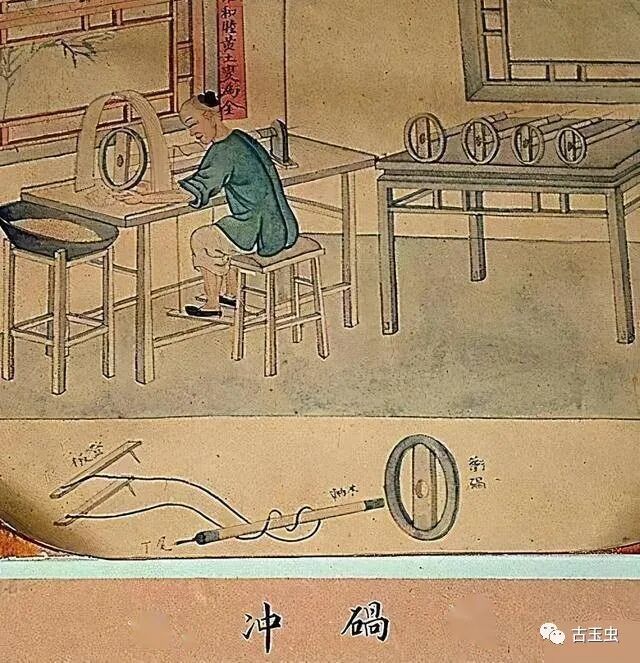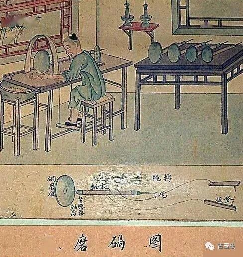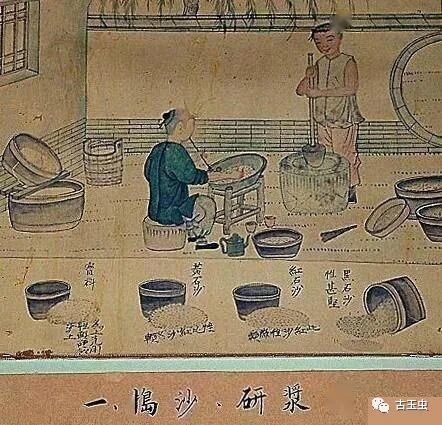 图中,站着的玉工手拿着杵,一下一下地用杵去捣,关注:古玉虫。要把石臼里的石沙敲得更细碎。另一位玉工坐在凳子上,面前放了一个好像炒菜锅样的大筛子,筛子的底有细洞,可以让细小的石沙漏下去,粗沙就留在筛子中,这样就可以把石沙按照颗粒大小分类。