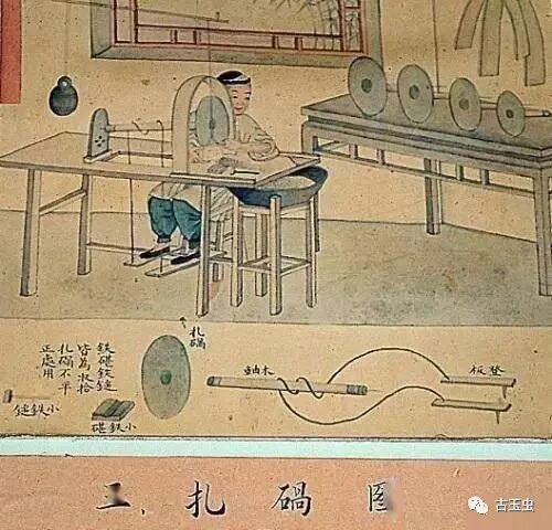 玉工坐在“旋车”前,旋车上架着的工具,结构颇复杂。这组工具是用长木棍的一端装上圆形的钢盘,这个钢盘就叫做“扎碢”。钢盘的周缘很薄,像刀口一样锋利。木轴上缠绕着两根绳子,绳子下端各系一片木板,这两片木板叫做“登板”。