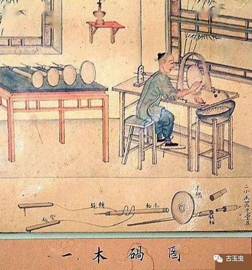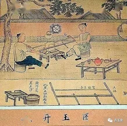 故宫博物院玉器馆有《制玉图》一套,是清光绪十七年李澄渊所绘《玉作图》,共 12 幅。制玉图风格写实,记录描绘出制玉的主要步骤。每图分上下两部分。上部描绘出制玉的手法,下部描绘出此手法所使用的工具。