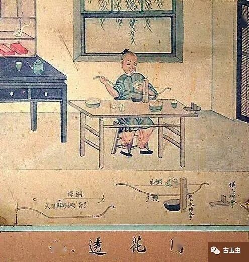 这是专门针对像鼻烟壶、扳指、烟袋嘴之类的小而有固定形状的玉器要钻孔时所用的特殊技巧。因为这类玉器太小了,不方便用手拿着打钻,所以就在大竹筒中装了水,上面安装木板,木板中央挖了洞,洞的形状和要钻孔眼的小玉器形状相同。不同形状的小玉器,要配上挖了不同形状孔洞的木板。