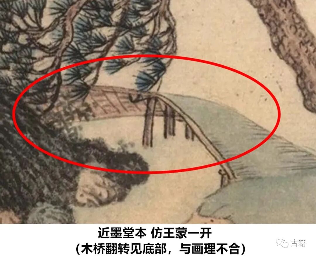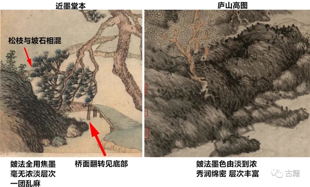 近墨堂本中有一开仿王蒙,正好《庐山高图》也是仿学王蒙,二者可以对比。《庐山高图》中,皴笔秀润绵密,由淡到浓的皴擦先用湿墨,再用浓墨,最后用焦墨点醒,墨色层次丰富,画法来自于王蒙《青卞隐居图》。而近墨堂本左侧山石也确实是解锁皴或短披麻,但墨色完全用焦墨,既黑又干,随意涂抹,乱成一片,毫无层次和明暗之别,亦无点苔。再看桥,从桥面延伸往前,直接看到大部分桥底部,与画理不合。而桥右松树的左侧树枝倾垂,与墨色浓重的坡石混为一体,还有松树枝叶整齐排布,呆板僵硬。总之画法水平与沈周差距太大,可鉴定为伪作。