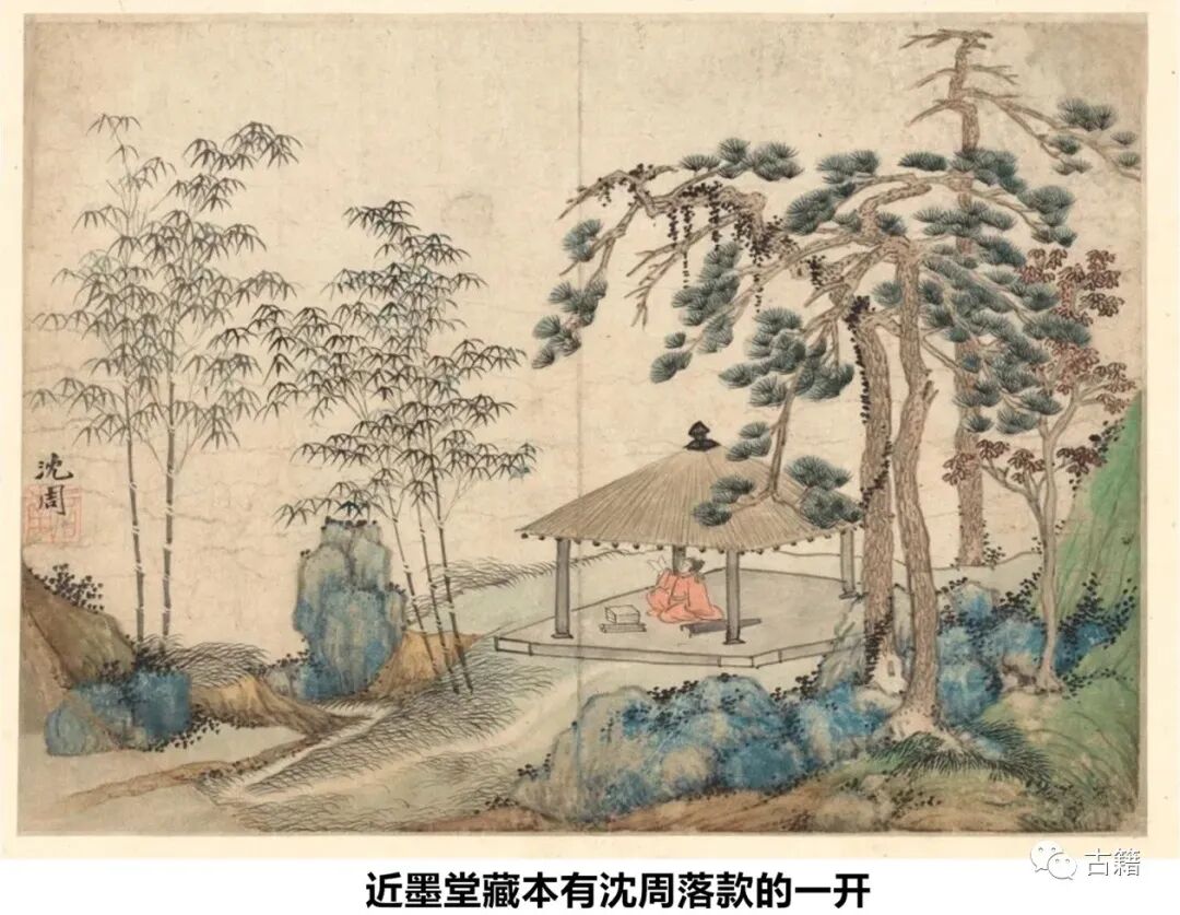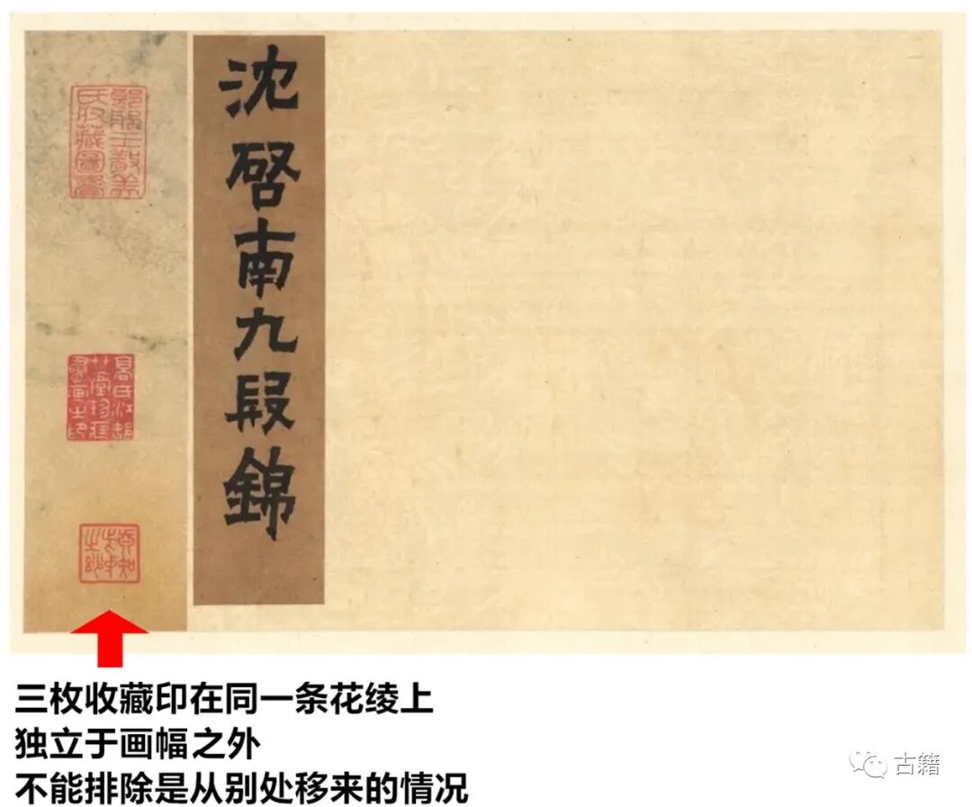 本册中的藏印如王世懋“琅琊王敬美氏收藏图书”,高士奇的“高氏江邨草堂珍藏书画之印”和“真知此中之妙”,三印都在一条花绫上,独立于画册之外,并不能排除是从别处移来的。虽然近墨堂本与高士奇著录信息接近,但未必是高士奇著录本,即使是,那也不能证明本套册页是沈周真迹。