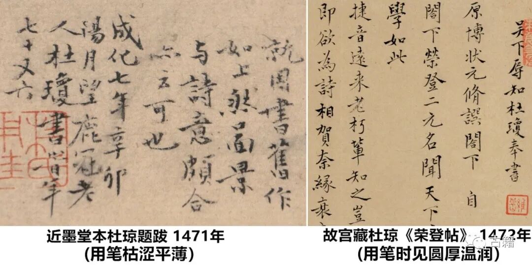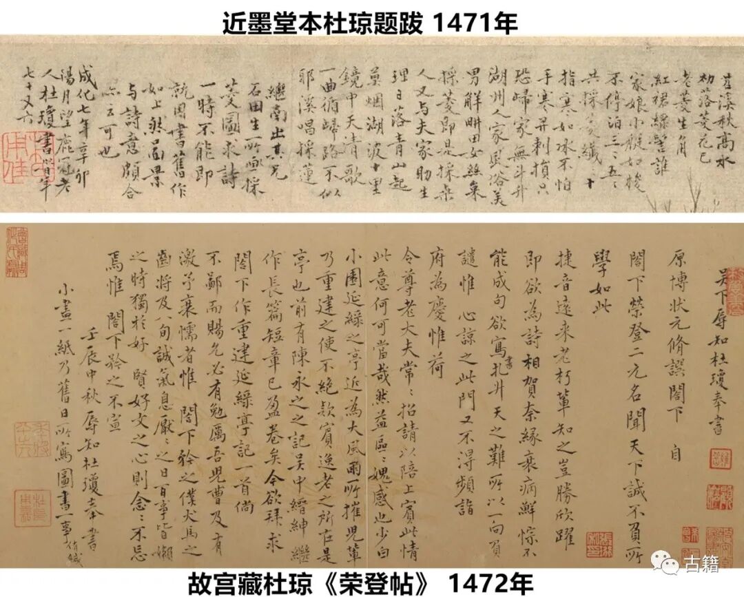 另外,近墨堂本有杜琼题字,年款为成化七年(1471)。杜琼是沈周的长辈,如此处题诗是真迹,那么是断定此册为真的重要依据。本文选取故宫收藏的杜琼《荣登帖》(1472年)真迹对比,也会发现近墨堂本与之差距甚远。