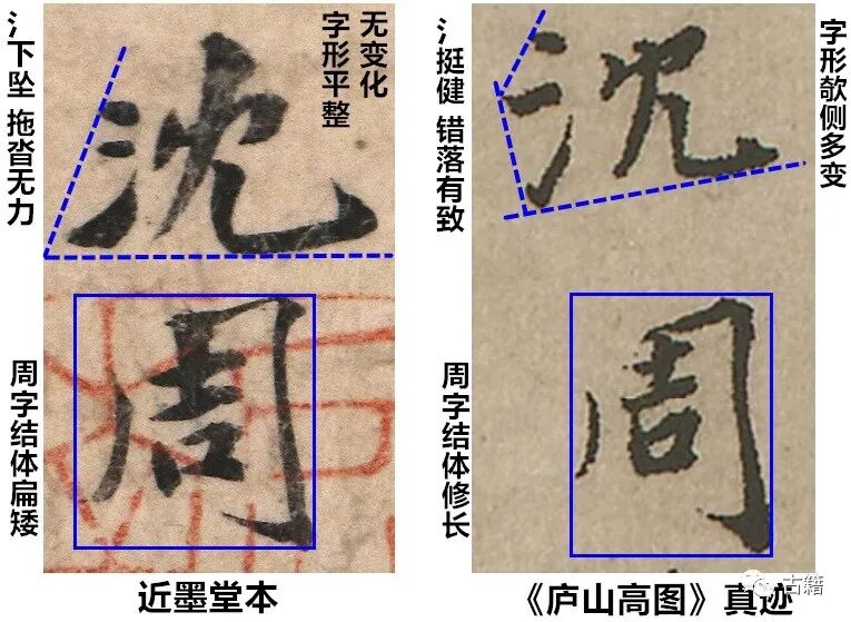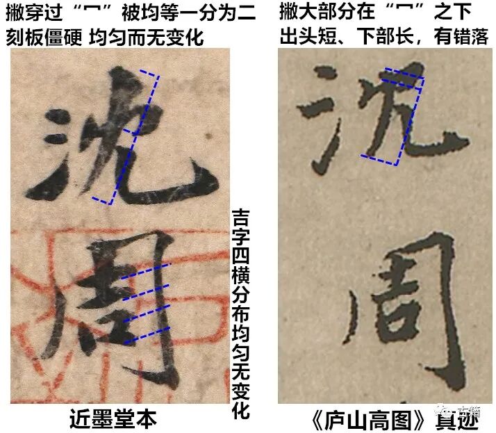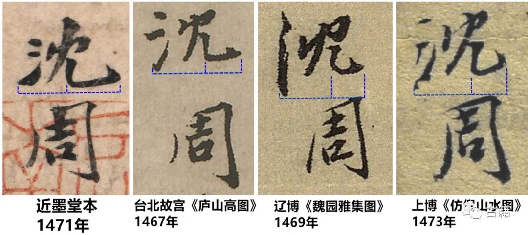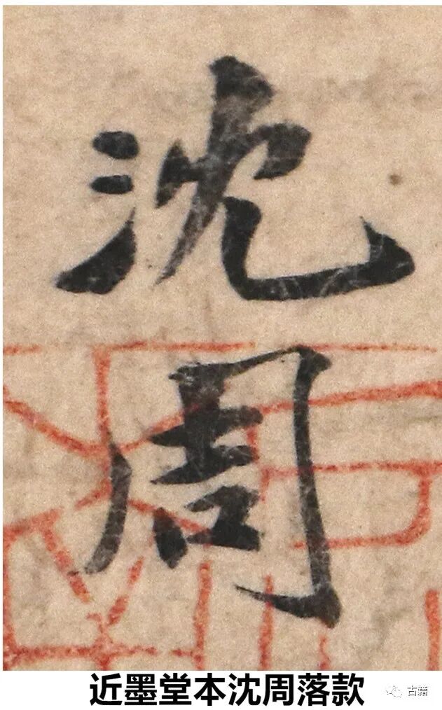 然而近墨堂本落款,两字章法并非错落,而是上下对齐,毫无变化。结体也无欹侧变化之态,且“周”字过于矮扁,不像真迹稍显高而长。特别是行笔,“沈”字三点水往下坠落,最后一提臃肿拖沓,形如墨猪;“沈”一撇落笔重按,穿过“冖”被均等一分为二,收笔轻佻,而真迹的一撇大部分在“冖”之下,差别太大;还有“沈”的竖弯钩拖得很长,形似其晚年学黄庭坚书的风貌;“周”字“吉”的一竖,落笔拘谨迟疑,沉重含糊。