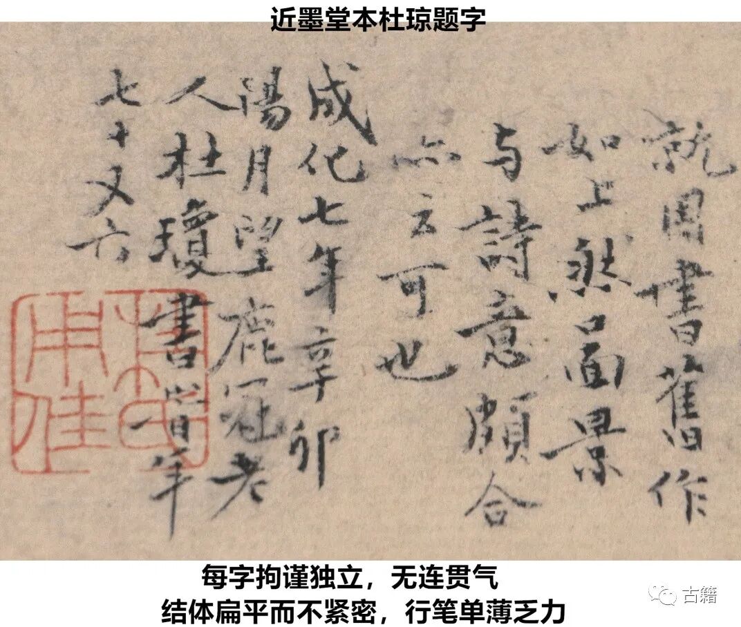 特别是对比“杜琼”二字落款,更能看出近墨堂本结体不稳、笔力嫩弱。尤其是“琼”字,结体和笔画完全变形,最后一捺轻佻乏力,又与上一行字相连,实在是软弱单薄。