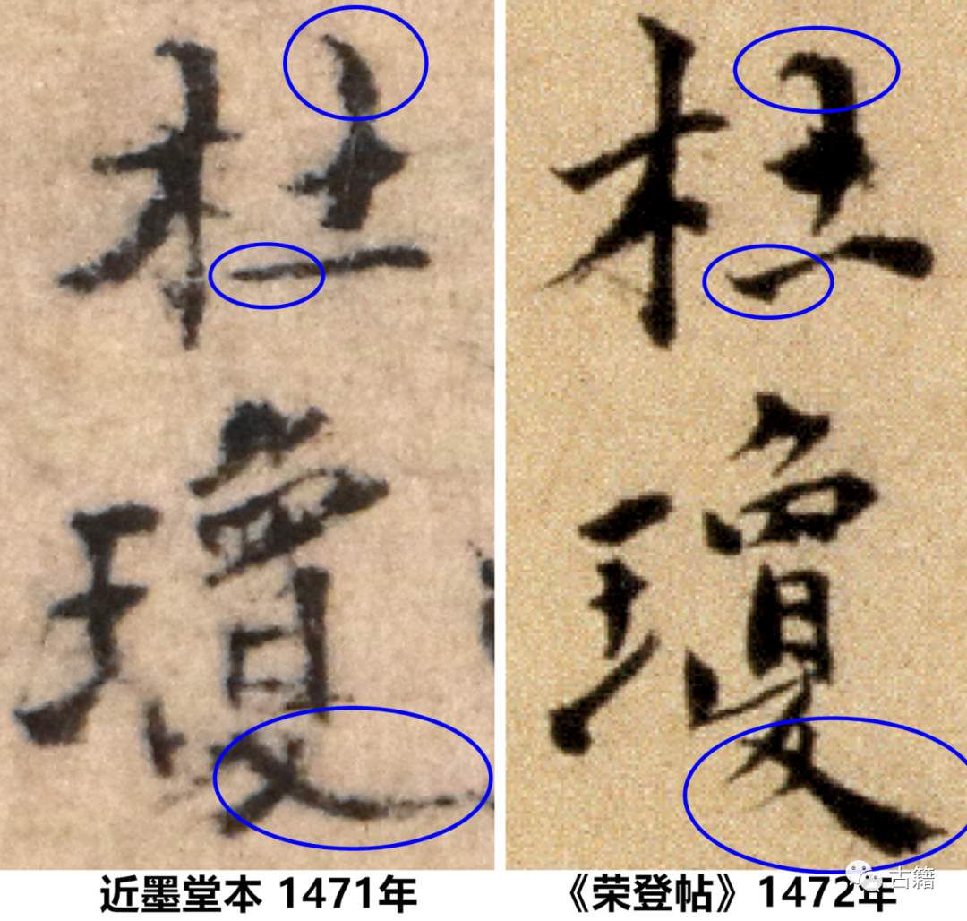 在章法上,故宫《荣登帖》行气紧密,每行字由上到下一气贯之,笔断意连,然而近墨堂本则分布均匀,每字拘谨独立,没有连贯气,有临写的迟疑之感。至于字的结体,杜琼真迹多瘦硬修长,有的笔画具有明初人学习晋人的圆厚韵味,结体朝左欹侧,而近墨堂本多宽扁,无欹侧变化,而且许多字结体不紧密,重心不稳。在用笔上,杜琼真迹硬朗遒健,提按有致,而近墨堂本则软弱无力,笔画单薄刻露。