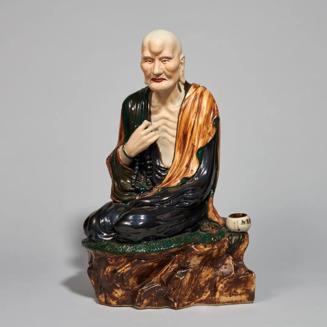 此尊罗汉雕塑充分展现了曾氏瓷雕高超的艺术造诣,属于曾龙升单一妙造罗汉,大有辽代三彩罗汉尊者古风。罗汉人物造型极富动感,端坐于石台之上、庄严肃穆,五官刻画慈瑞,额骨高耸,浓眉高目,双目微俯,面带肃穆,神态庄严;手握佛珠,衣饰线条流畅细腻。釉色纯正,人物塑造生动传神,具有极强的艺术感染力。