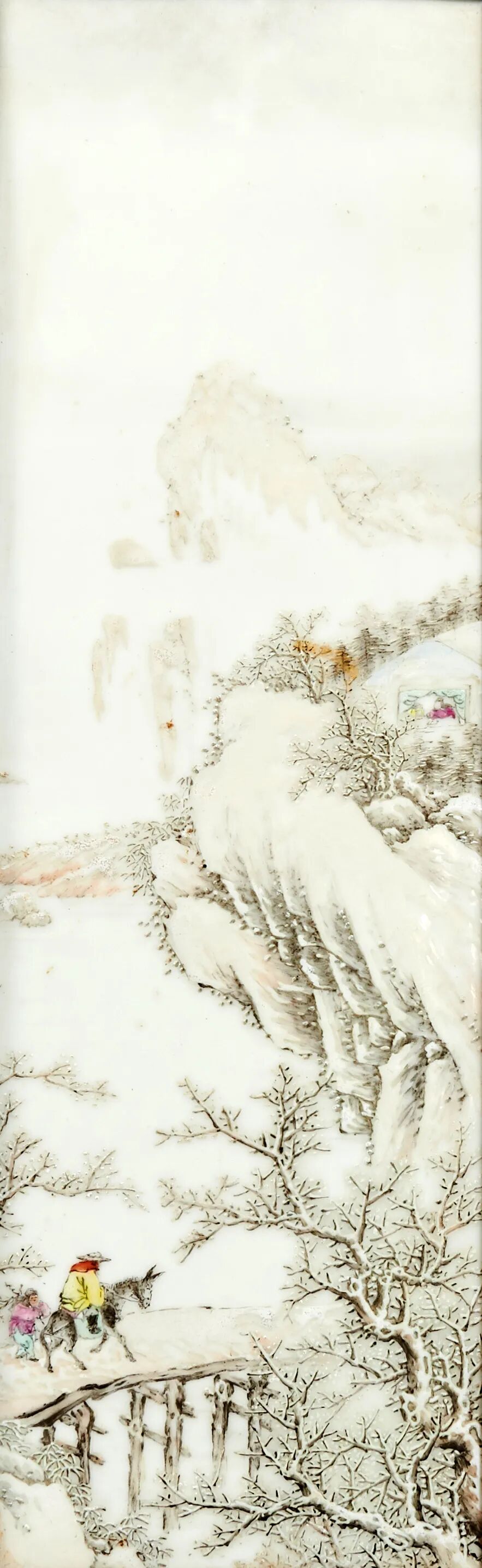 踏雪寻梅在构图上远承宋人造景取势之长,笔墨上取法四王,技艺上革故鼎新,巧妙地将粉彩玻璃白运用于雪景山水之中,画面浓淡自如,雪色逼真,层次有度,既达到了传统填色的粉润效果,又使画意生机盎然。踏雪寻梅图以粉彩绘雾弥江天,松梅冠雪,板桥横水,一派荒寒冷逸中,有高士乘蹇驴携仆童踏雪过桥。蹇驴驽弱,踏雪举步,留下了串串蹴踏蹄痕。构图上远承五代、宋人造景取势的传统,笔墨上取法清初四王中的王原祁,画面中远处的雪景寒林 ,苍茫空灵。近景的板桥树石,简括明快;而高士、蹇驴、僮仆,形像生动传神,应为何许人作品。