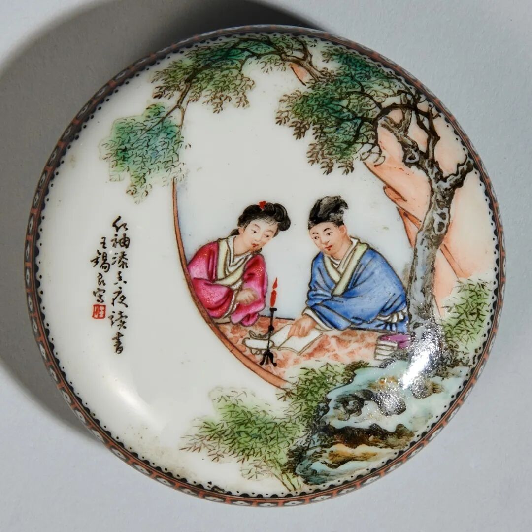 民国 王锡良粉彩红梅添香夜读书图印盒