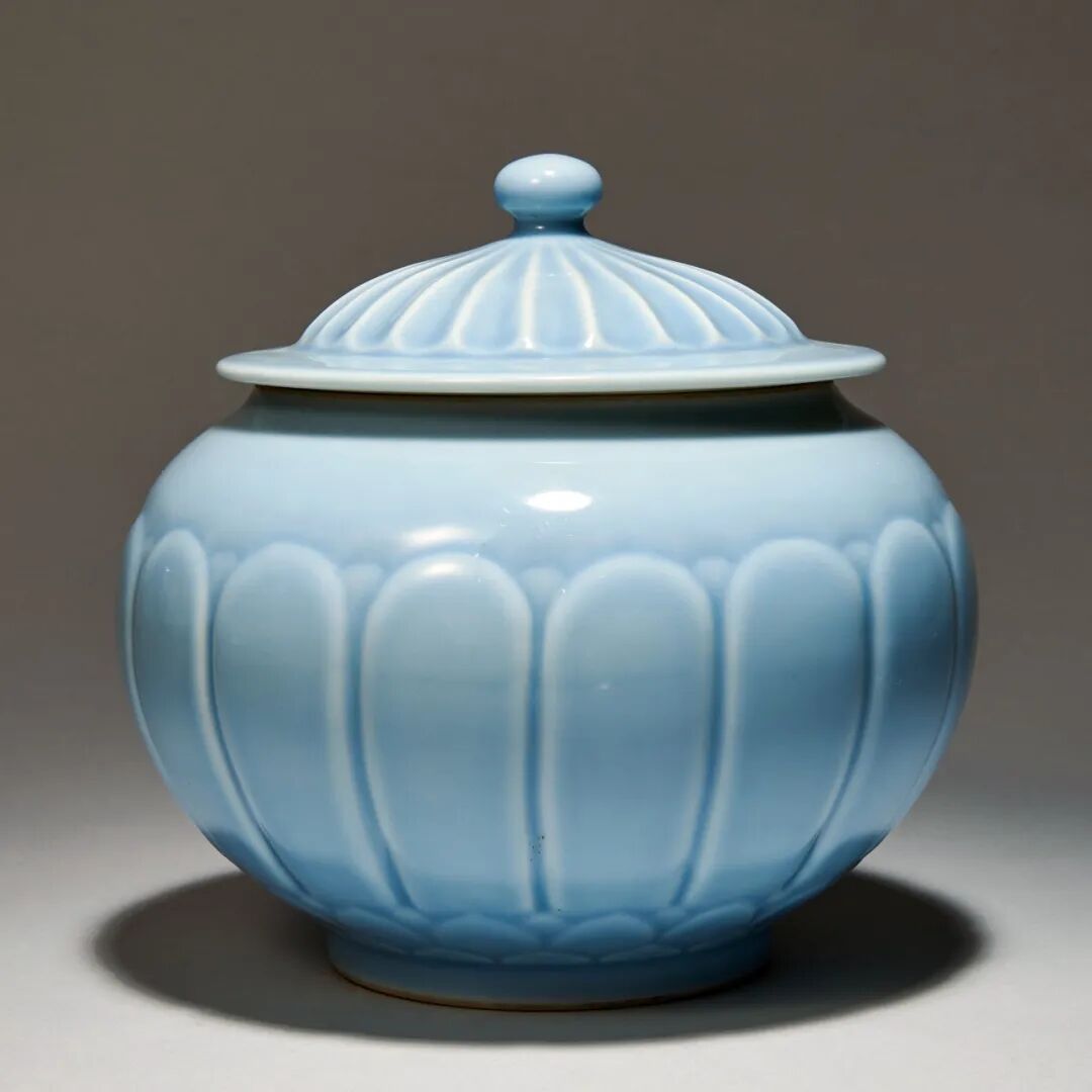 20 世纪50 年代 中国景德镇制天青釉菊瓣纹盖罐