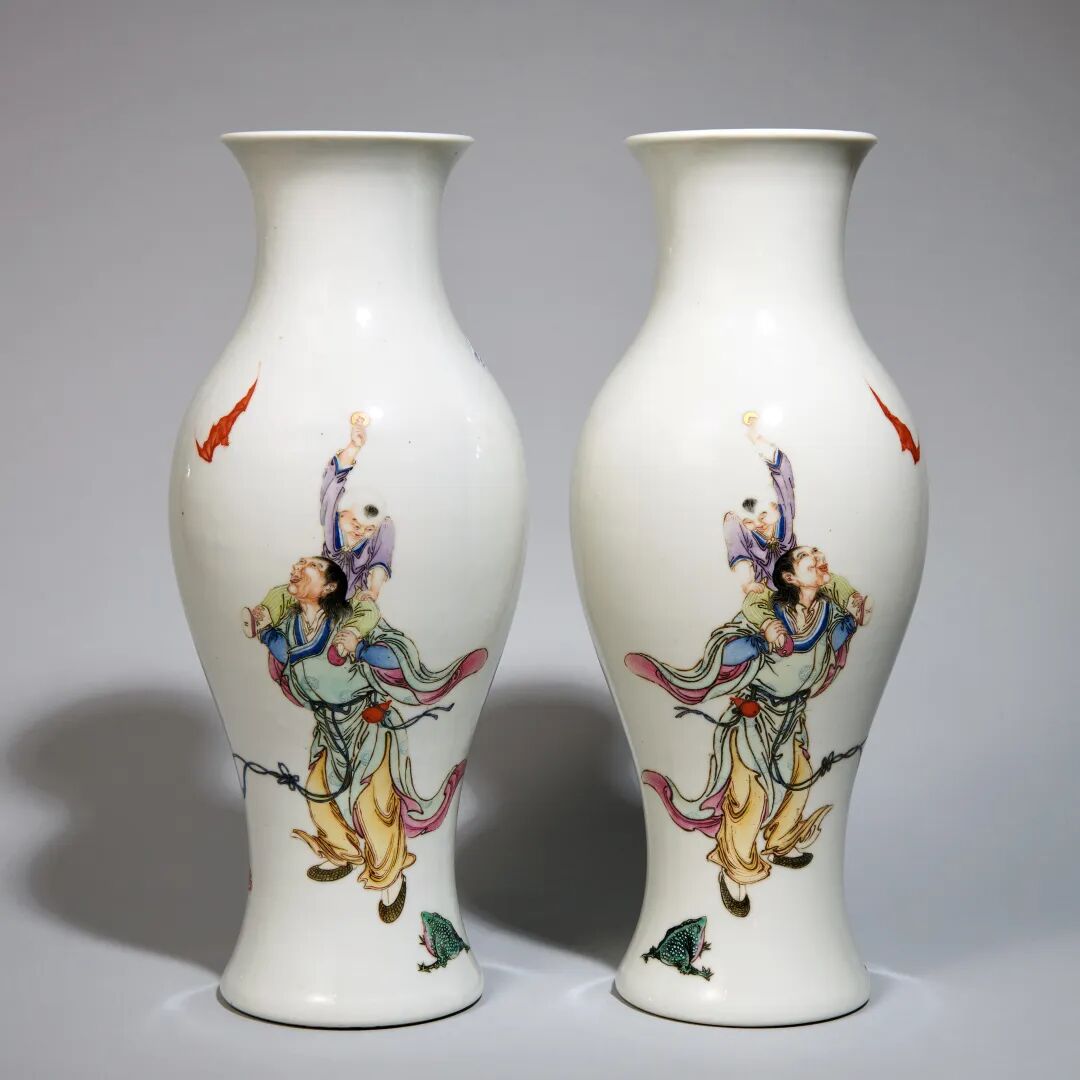 民国 粉彩刘海戏蟾图瓶一对