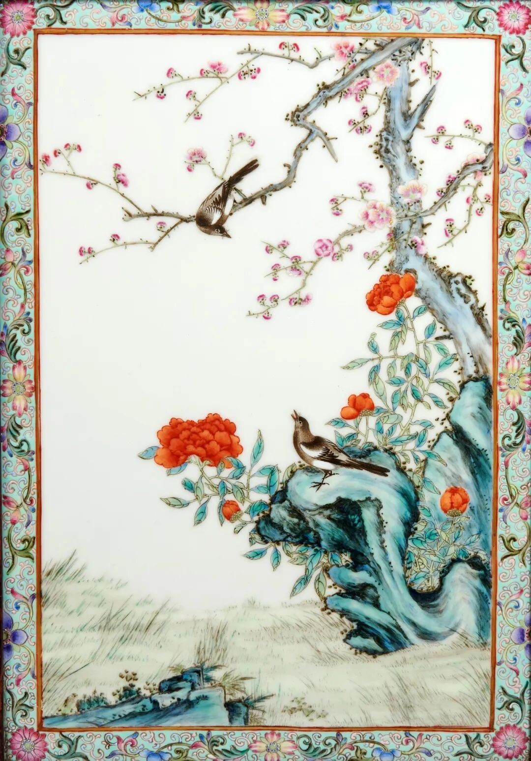 1911年后,何许人应詹元广、詹元斌兄弟聘,赴北京画仿古瓷。此次北京之聘,正值何许人而立之年,他得以见识于故宫旧藏的历代名画,饱览故宫历代名瓷,动笔临摹范宽、郭熙的画,并拜访京城前清遗老求教切磋,受益匪浅,感悟深刻,画艺大进,他之后的创作可见其影响。此作充满了乾隆宫廷雅逸之气,应为何氏进宫学艺后粉彩花鸟上乘之作。