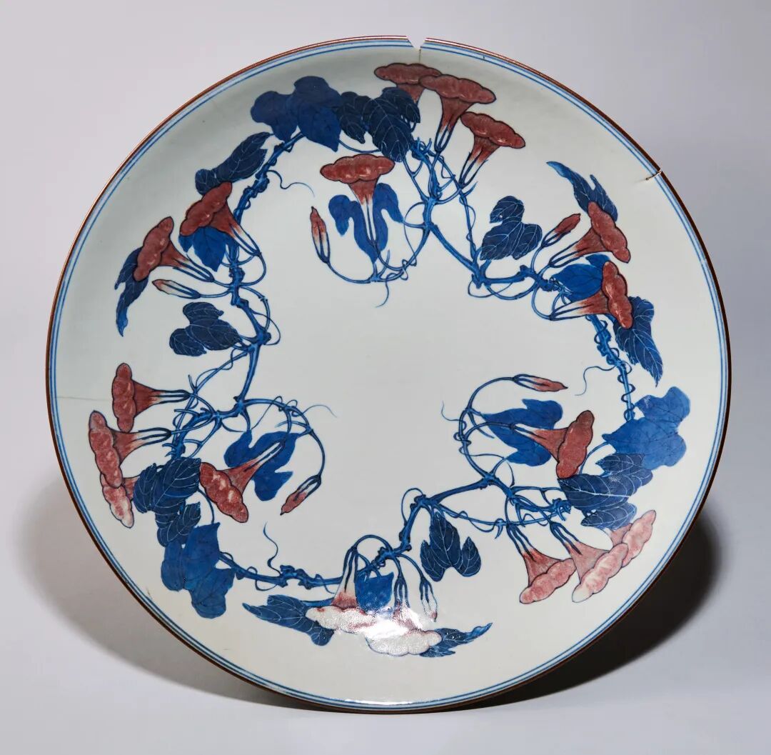 此件大盘以牵牛花为装饰题材,纹饰随器型旋转而变化,姿态横生,气韵生动,随着笔法的起伏转折,可见处处得势。体现出王步极为重视装饰与器型的统一关系。