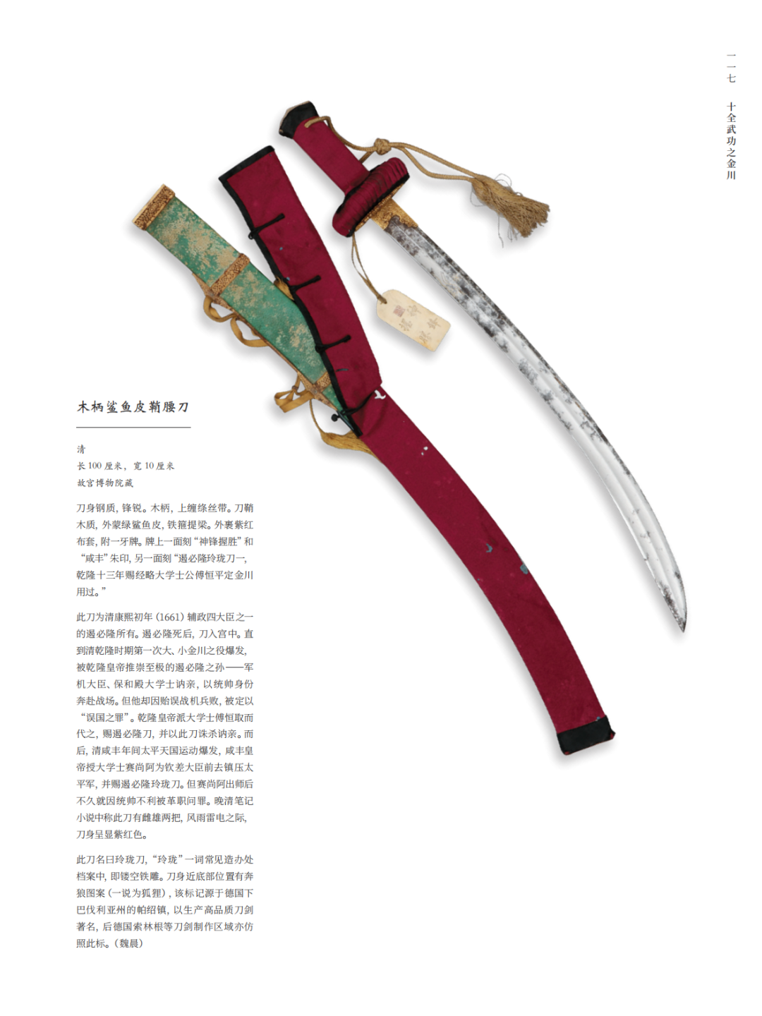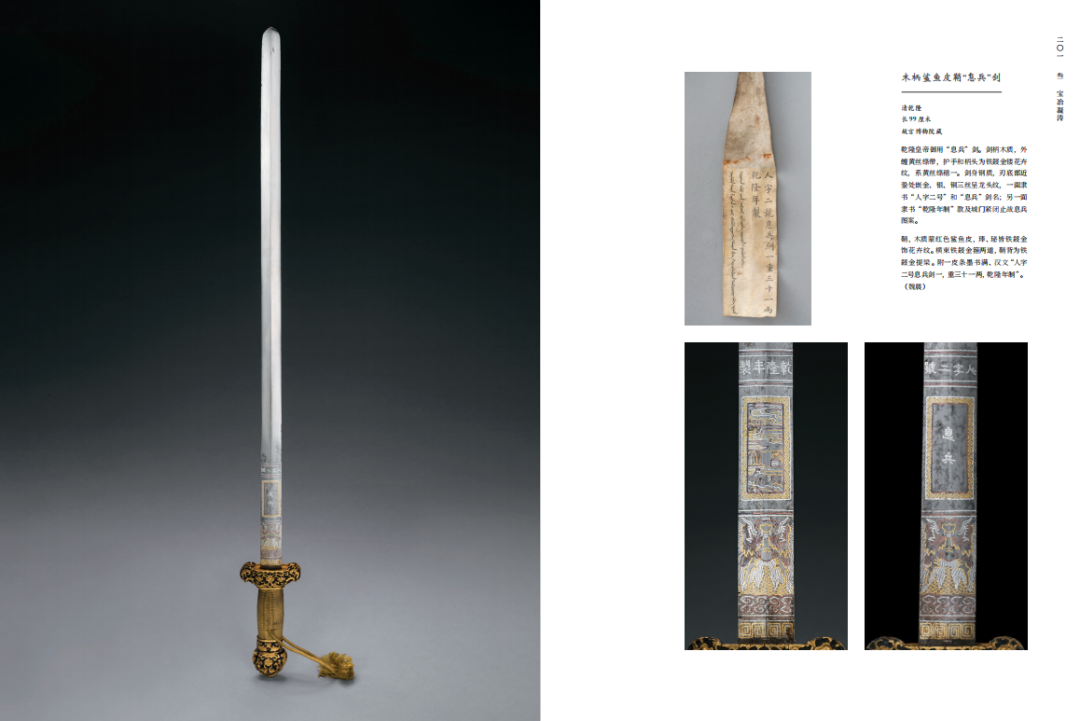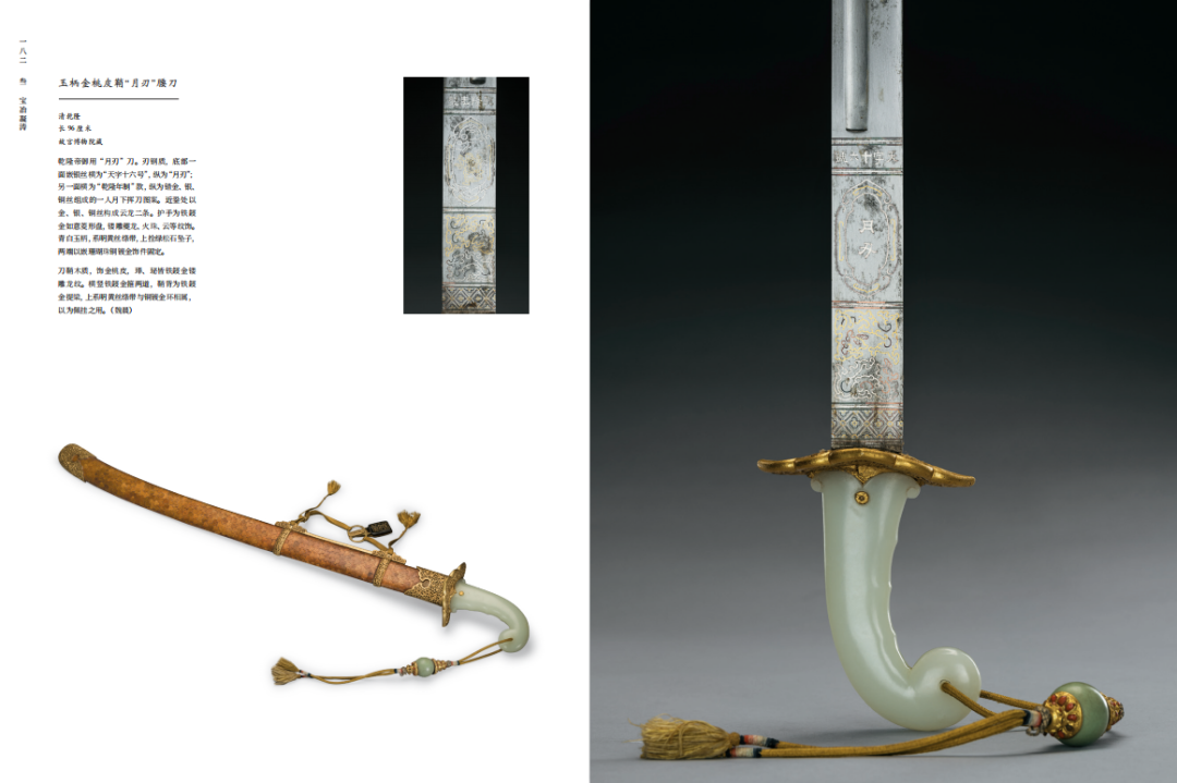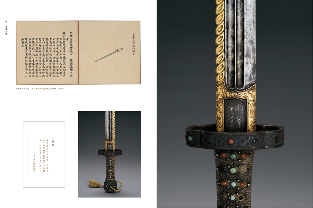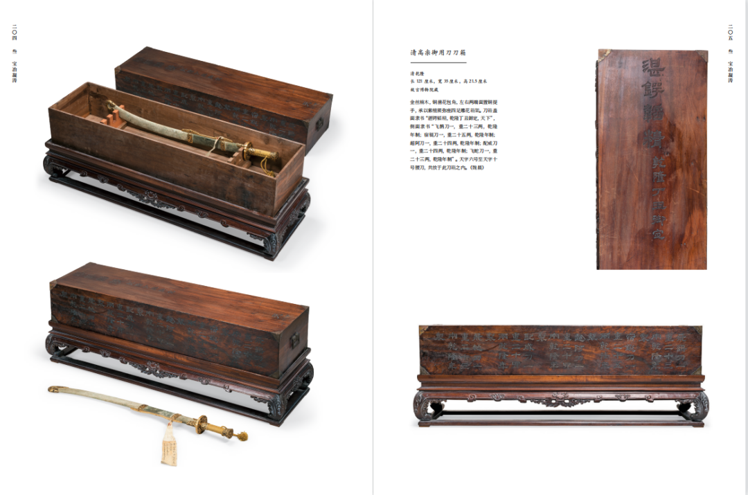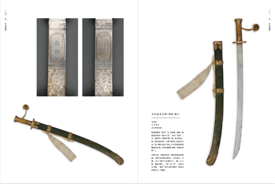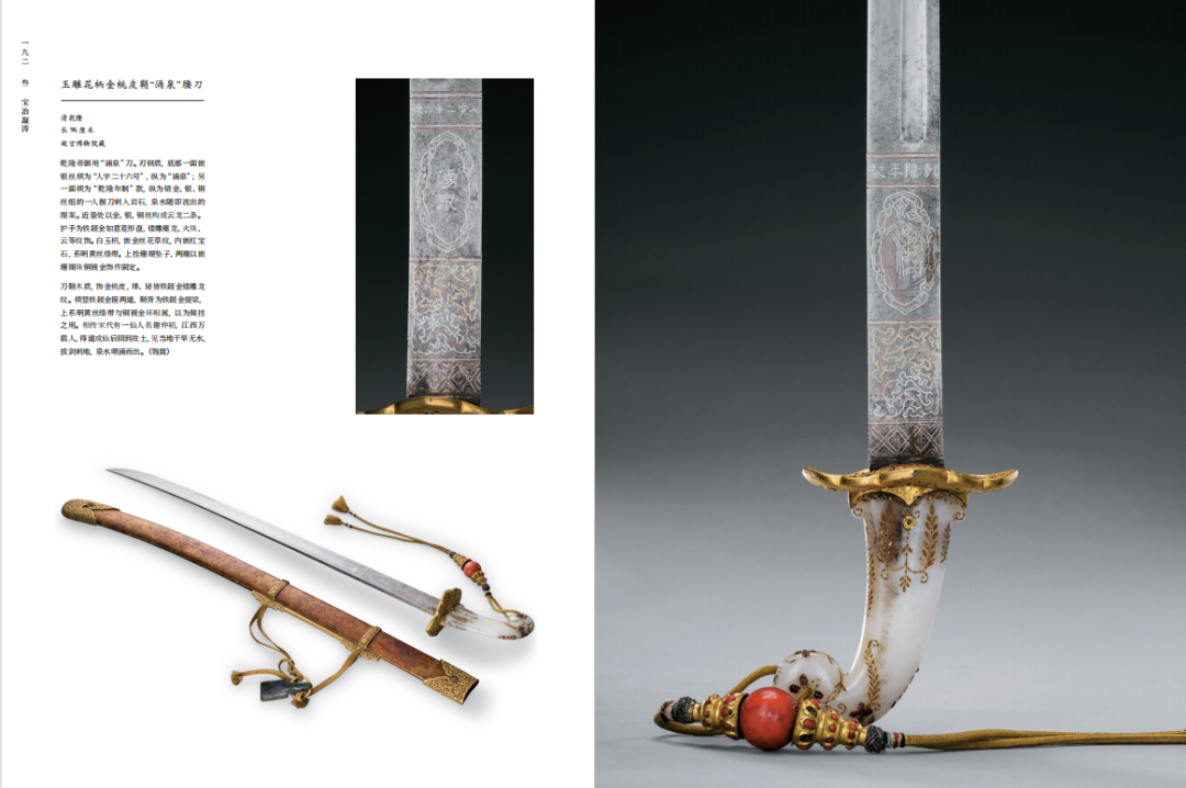 在本书第三单元“宝冶凝涛”中,收录的是乾隆皇帝的“天地人”系列刀剑。“天地人”刀剑是乾隆十三年始至乾隆六十年止,由内务府造办处打造的30把宝剑、90余把腰刀的总称。因其每把刀剑带有“天”“地”“人”的编号,因此得名。一直以来,这些乾隆御用刀剑都是众多武备爱好者关注的重点。但由于其绝大部分都收藏在故宫博物院,平时只零星展出,所以难得一见。此次书中收入了展出的12把“天地人”腰刀、宝剑,为历届展览之最,绝大部分更是从未公开过影像资料。书中还收录了盛放这批刀剑的乾隆御用刀箱,这些刻有制作年份、刀剑名称的楠木箱是研究“天地人”刀剑的重要资料。