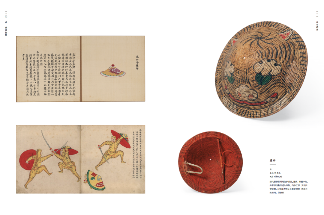 清代日常检验八旗的训练情况而设有大阅制度。书中全面展现了皇帝大阅全套武器装备。以南苑大阅为例,大阅之日,皇帝从南苑行宫至晾鹰台,御黄幄,稍事休息后,身着铠甲,腰悬撒袋、宝刀,手握马鞭,纵马至武场,大阅开始。清代大阅规模盛大,仅参加的步兵、骑兵、炮兵等就有一万八千七百七十一人之多,兵种有前锋营、护军营、骁骑营、火器营等,内容包括较射、火器演放、阵法演练等等,蔚为壮观。书中收录的“调前锋护军营官兵”合符、飞虎斧、藤牌营藤牌、锁子甲和火枪等,让读者于纸上一睹清代习武练兵的壮观景象。