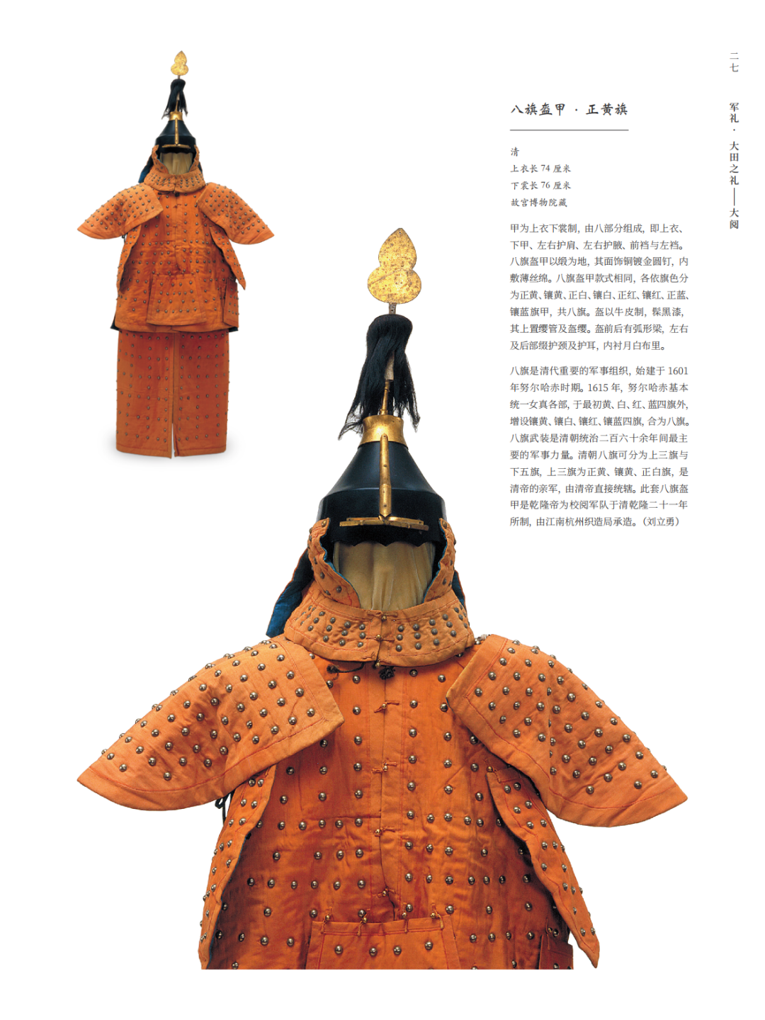 八旗武装是清朝统治二百六十余年间最主要的军事力量。书中收齐八套八旗盔甲,是八旗士兵在接受皇帝大阅时所穿棉甲,是乾隆皇帝为了体恤八旗士兵,下令制造的不用铁叶的棉甲。八旗是清代重要的军事组织,始建于1601年努尔哈赤时期。1615年,努尔哈赤基本统一女真各部,于最初黄、白、红、蓝四旗外,增设镶黄、镶白、镶红、镶蓝四旗,合为八旗。清朝八旗可分为上三旗与下五旗,上三旗为正黄、镶黄、正白旗,是皇帝的亲军,由清帝直接统辖。