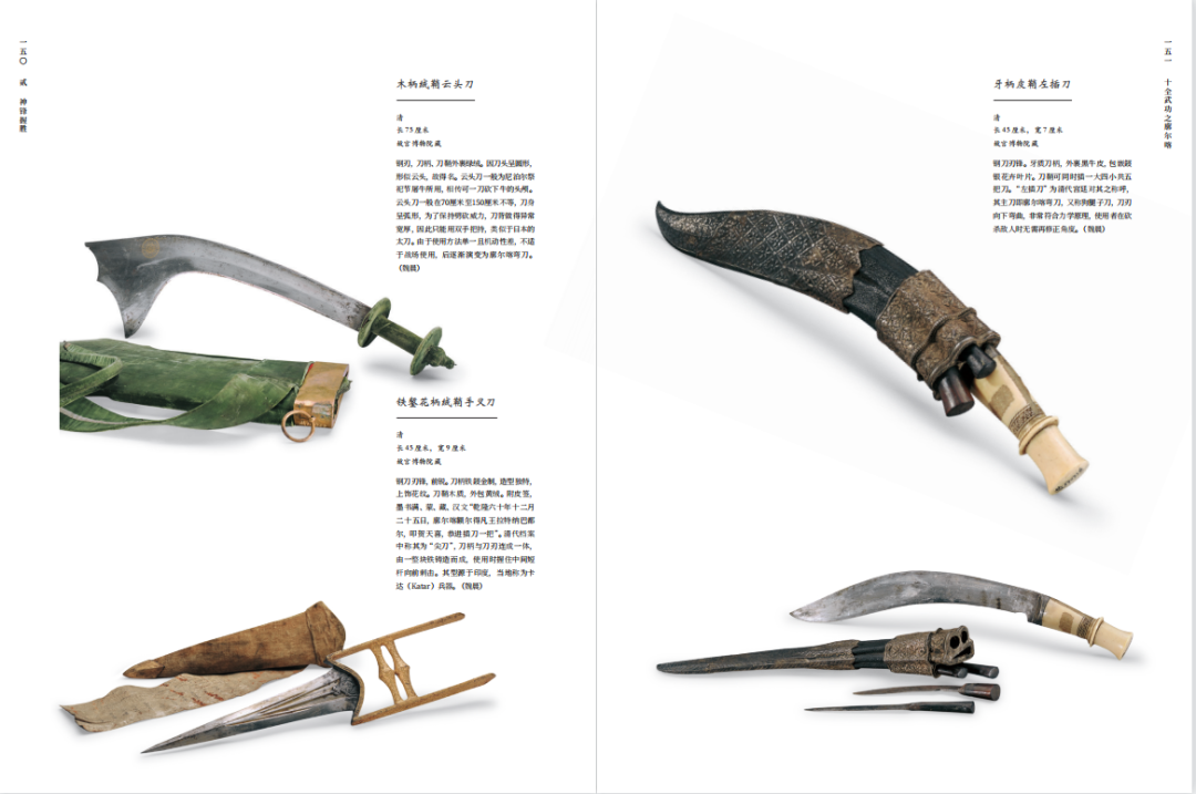 清乾隆皇帝有生之年多次用兵,征抚漠西蒙古,统一新疆回部,平定大小金川,反击廓尔喀侵藏等。其号称的“十全武功”,使统一的多民族国家得到巩固和发展。但自诩十全老人的他,并不以武力为耀,坦言“武功不过为君之一事”。以武为常,但不轻试其锋,战争只是手段,和平才是最终的目的。在其统治下的中原王朝,社会安宁、经济繁荣,保持着强大的威严与向心力。而各民族地区进献的武备用品成为民族大团结的最好体现。在书中的“神锋握胜”单元,收录清宫收藏的所有廓尔喀刀,有威风凛凛的弯刃腰刀,有可以一刀剁下牛头的云头刀,还有被认为最符合力学原理的廓尔喀弯刀。还有一把土尔扈特部首领渥巴锡献给乾隆皇帝的腰刀,是为中华民族团结统一的历史见证。来自六世班禅额尔德尼、四世哲布尊丹巴胡图克图进献给乾隆、嘉庆两位皇帝的刀剑,以及彼得一世时期制作的俄罗斯剑,琉球国进献的精美太刀,高丽国特有的巨大刀具,令人叹为观止。