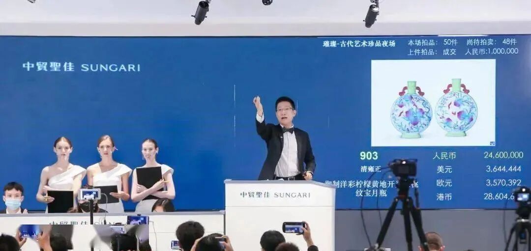 作为封面拍品之一,清雍正御制洋彩柠檬黄地开光九桃纹宝月瓶可谓备受关注,在拍卖现场,从680万元起拍,最终以2460万元落槌,加佣金2829万元成交,荣登内地春拍本轮Top榜!