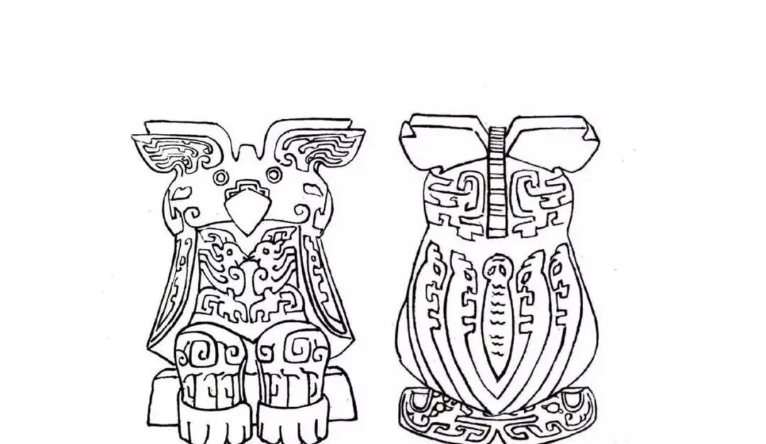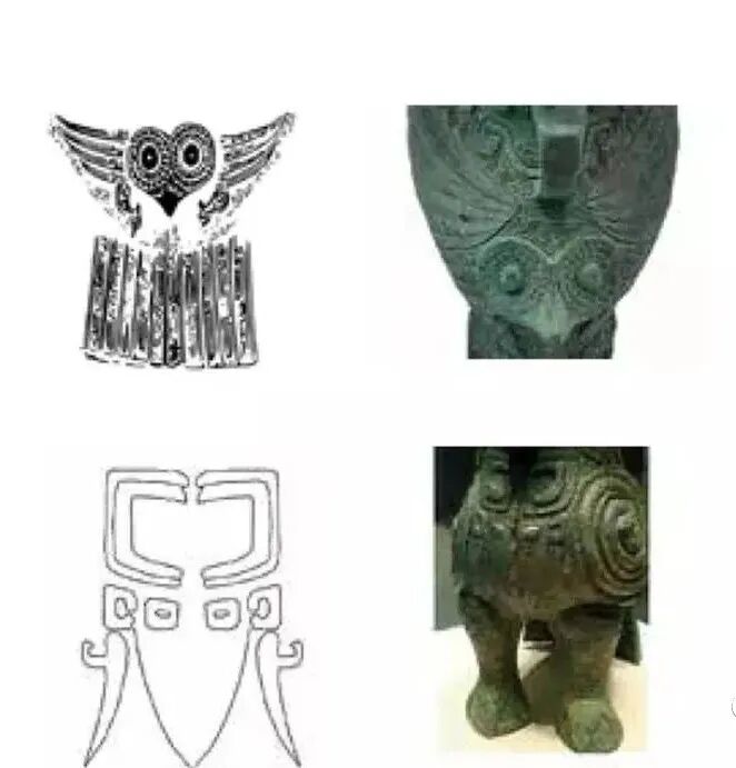 之后由竖长形演变为横长形,体、翅、足抽象化,有夸张的双目,是为鸮面形。