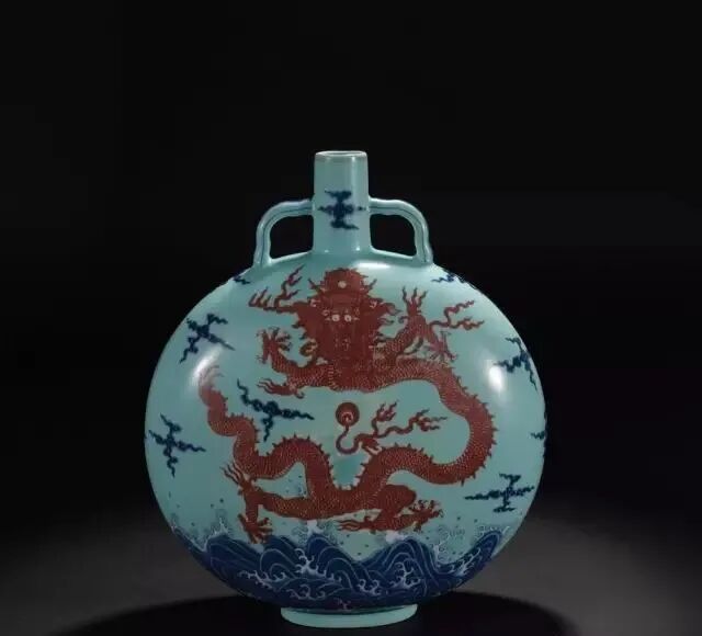 清乾隆 松石绿地青花釉里红云龙纹抱月